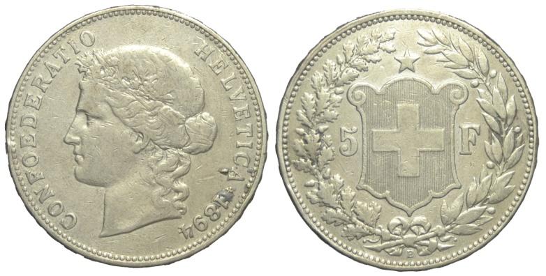 Svizzera / Confederazione 5 Franchi 1894 - Svizzera / Confederazione5 Franchi 1894 – RR AG mm 37 – millesimo molto raro, spillatura ...