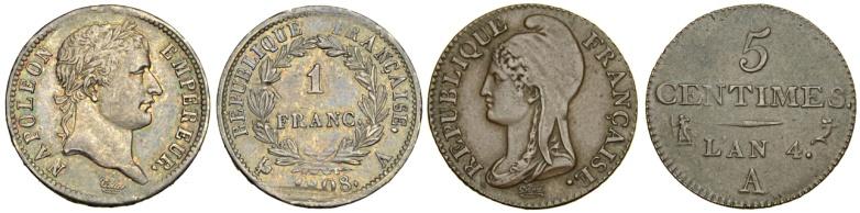 Francia – Lotto di 2 Monete - Francia – Lotto di 2 Monete:Franco 1808 A AG difetto di conio al R/ altrimenti BB+ ;5 Centimes AN 4 q.SPL