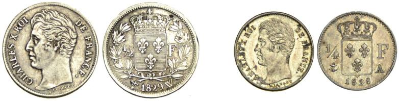Francia (1824-1830) Lotto di 2 Monete - Francia – Carlo X (1824-1830) – Lotto di 2 Monete:Mezzo Franco 1829 W q.SPL ; Quarto di Franco ...