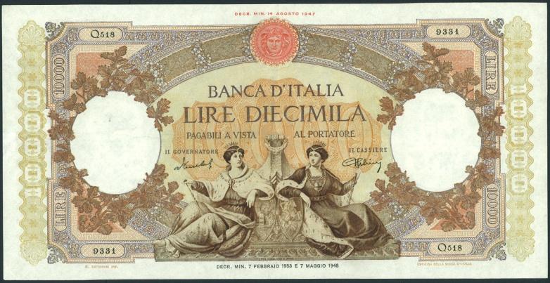 Repubblica Italiana 10.000 Lire 7/2/1953 - Repubblica Italiana (dal 1946)10.000 Lire 7/2/1953 – NC mm 243x126 Stirata altrimenti SPL