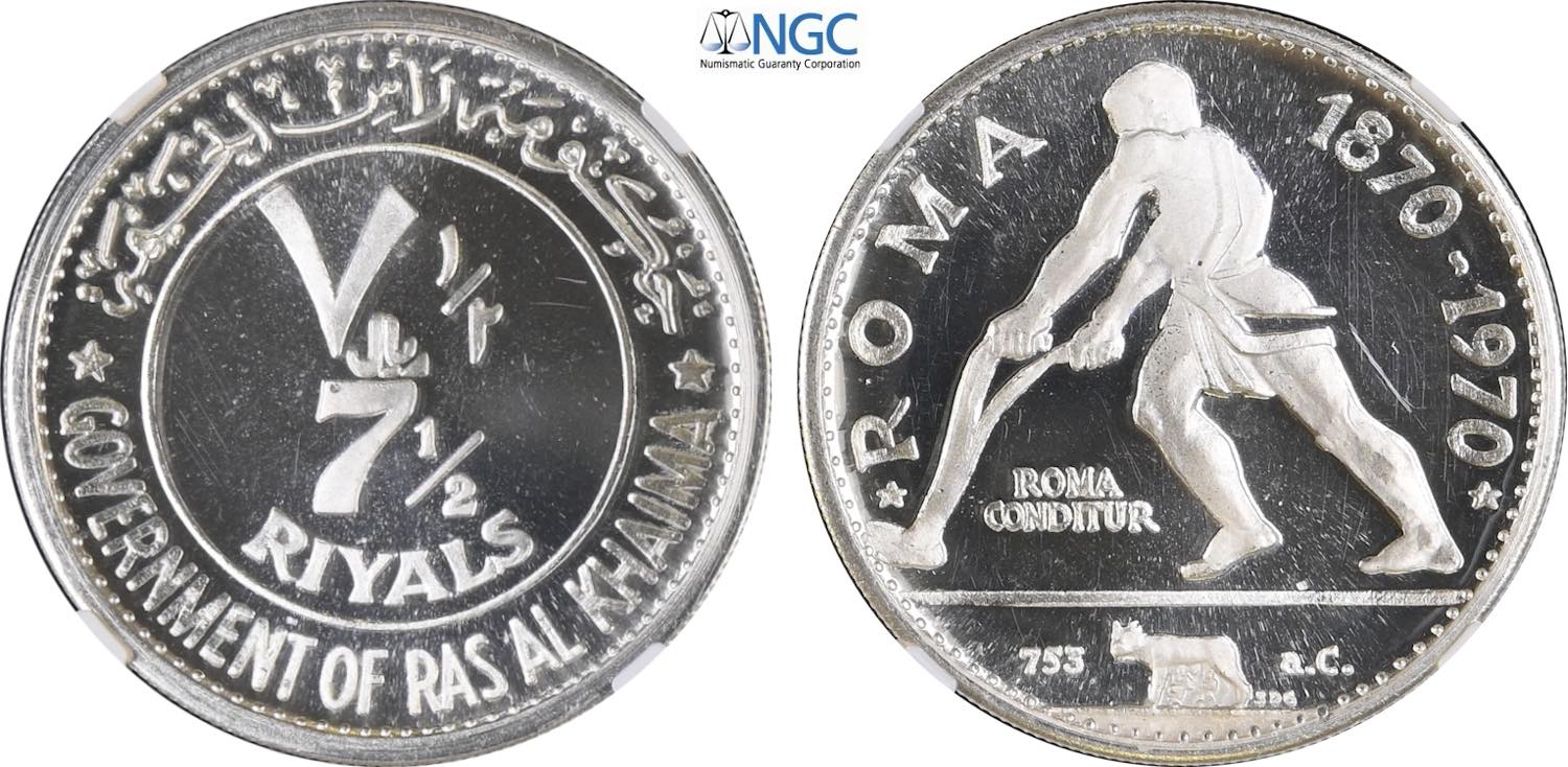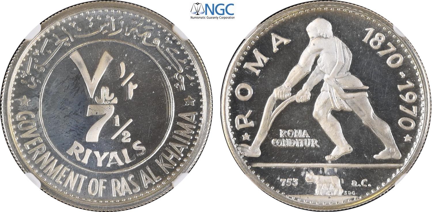 Ras Al-Khaimah, United Arab Emirate, Saqr Bin Muhammad al-Qasimi (1948-), 7,5 Riyals 1970 Centennial of Rome, mintage: 2000, KM-17, Ag 34 ...
