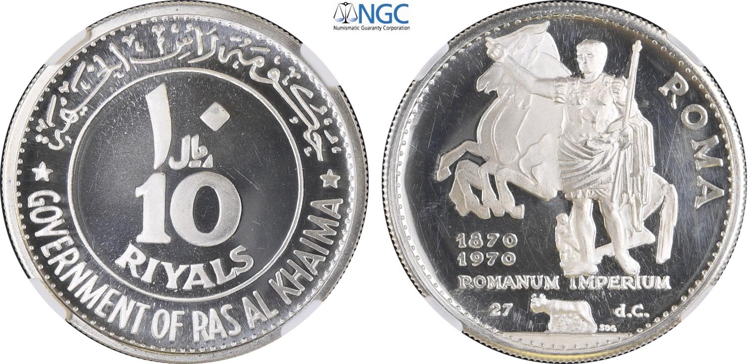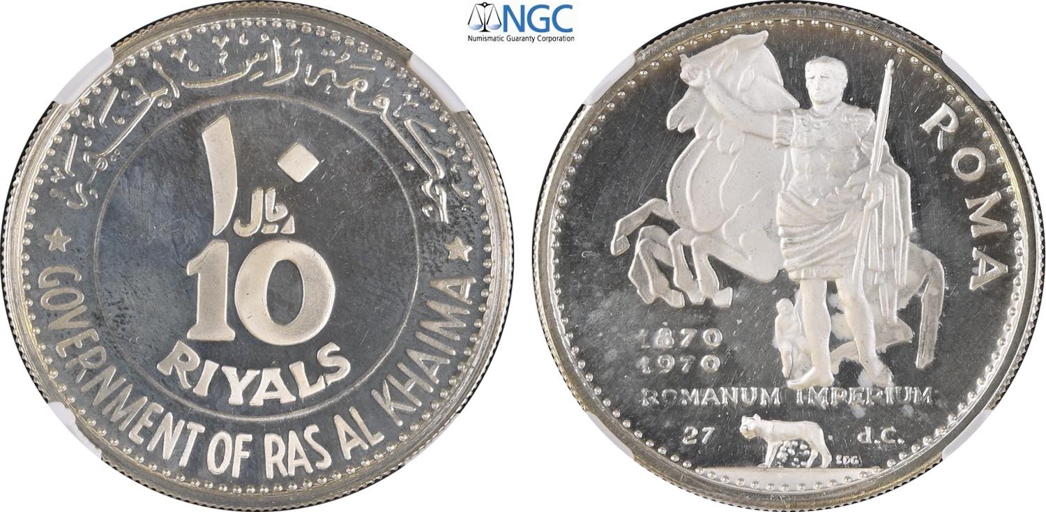 Ras Al-Khaimah, United Arab Emirate, Saqr Bin Muhammad al-Qasimi (1948-), 10 Riyals 1970 Centennial of Rome, mintage: 2000, KM-18, Ag 41 ...