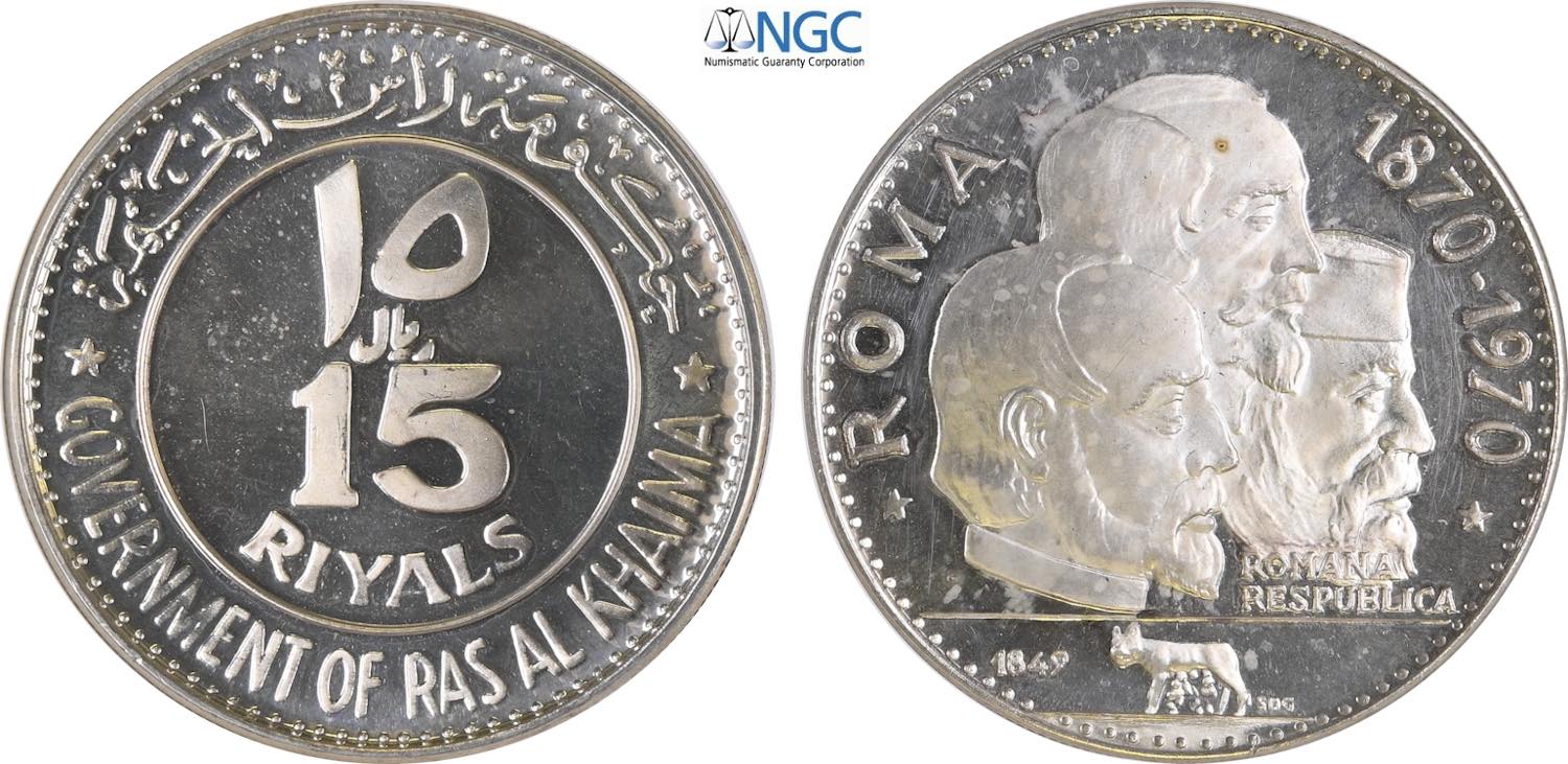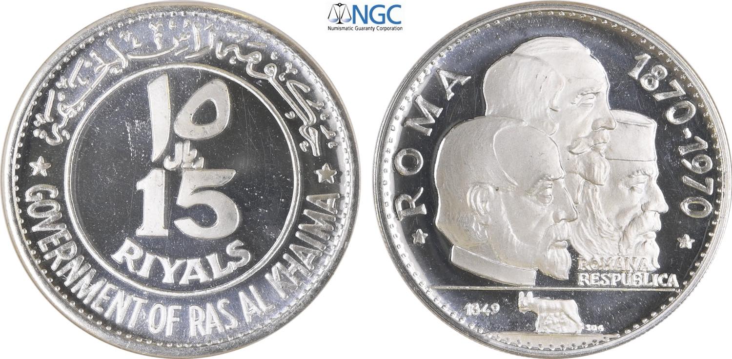 Ras Al-Khaimah, United Arab Emirate, Saqr Bin Muhammad al-Qasimi (1948-), 15 Riyals 1970 Centennial of Rome, mintage: 2000, KM-19, Ag 44 ...