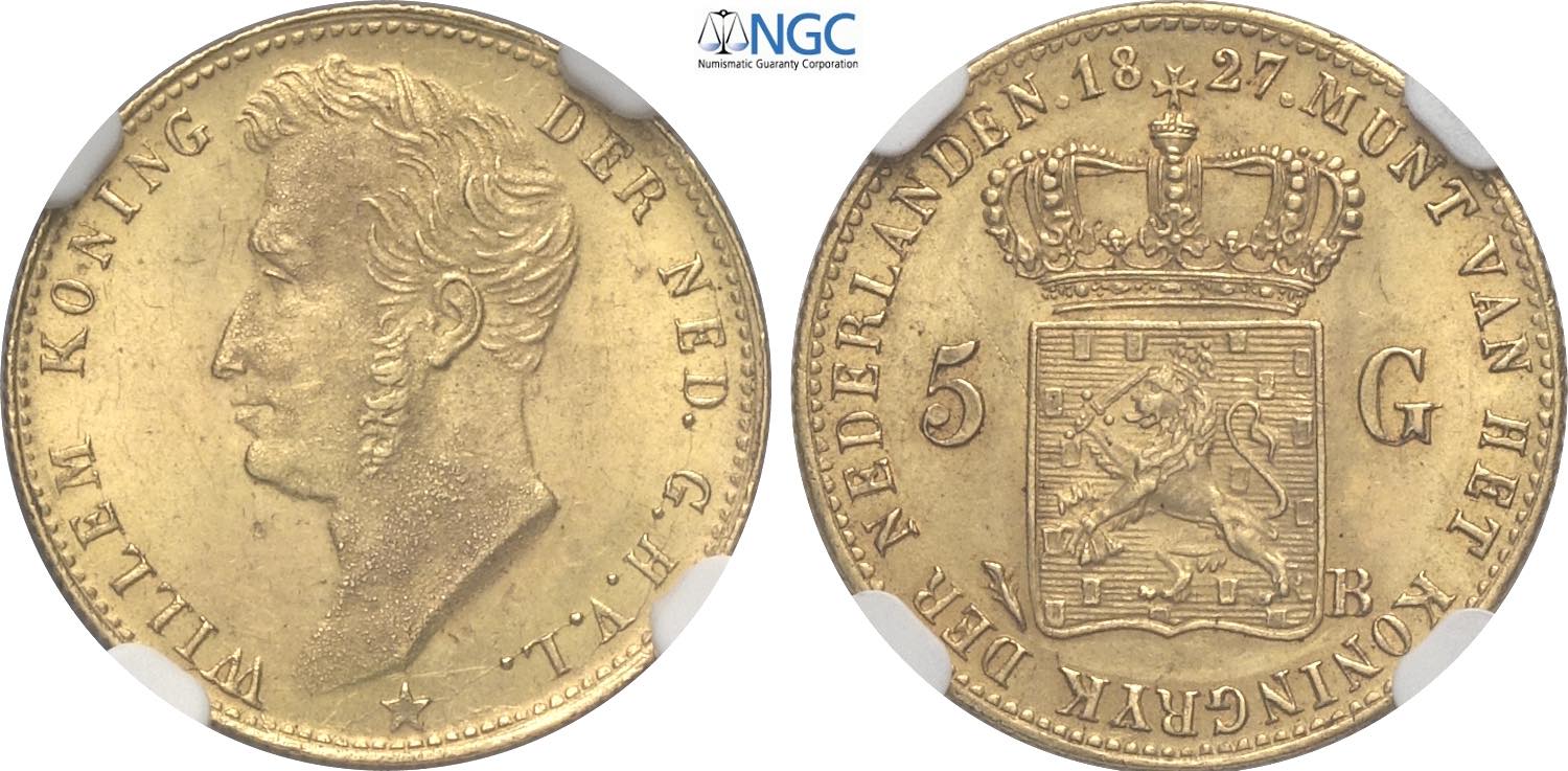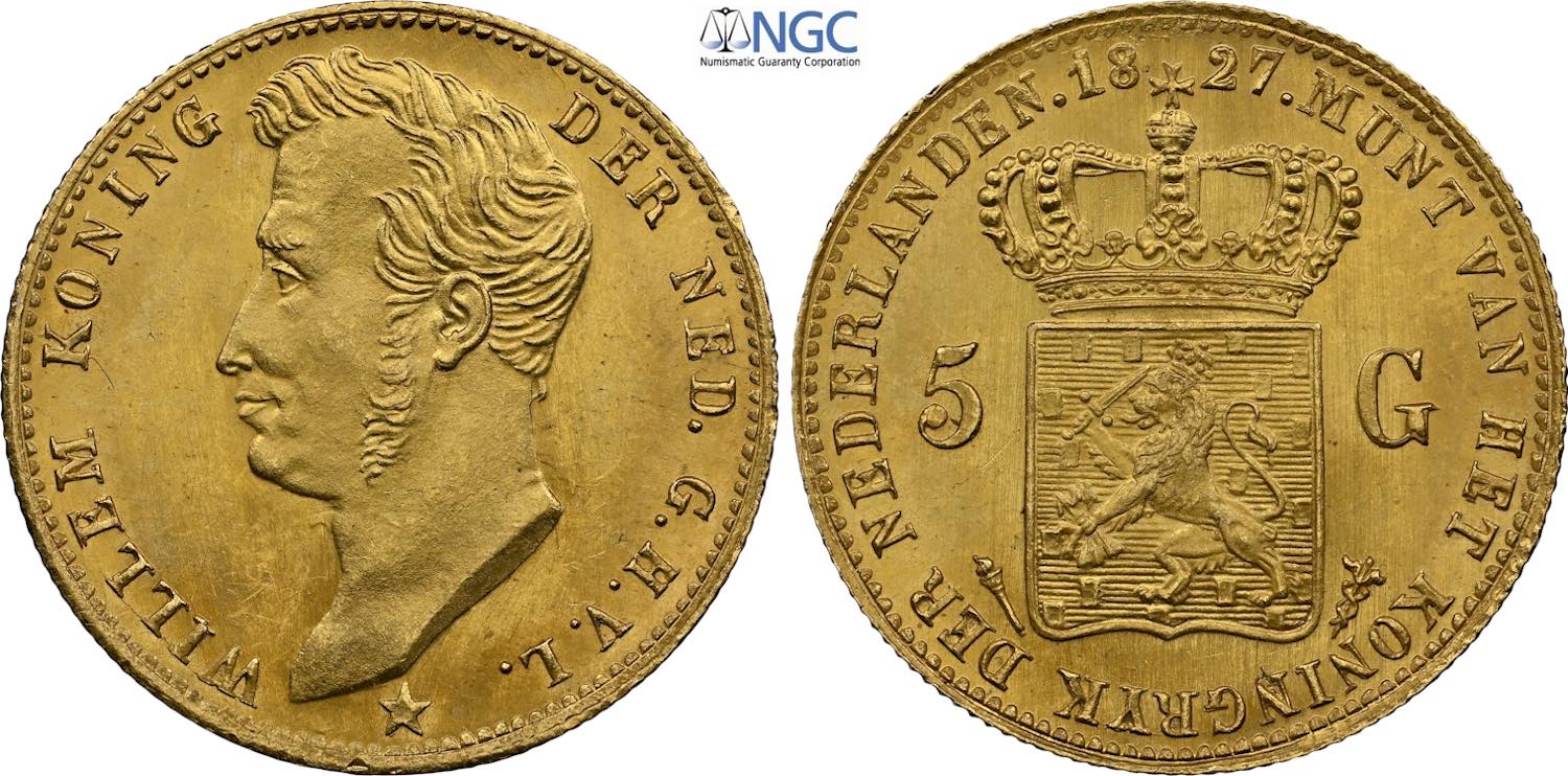 Netherlands, William I (1813-1840), 5 Gulden 1827, Utrecht mint, Au 18,5 mm, 3,36 g, in Slab NGC MS64 (only 1 coin is graded higher)