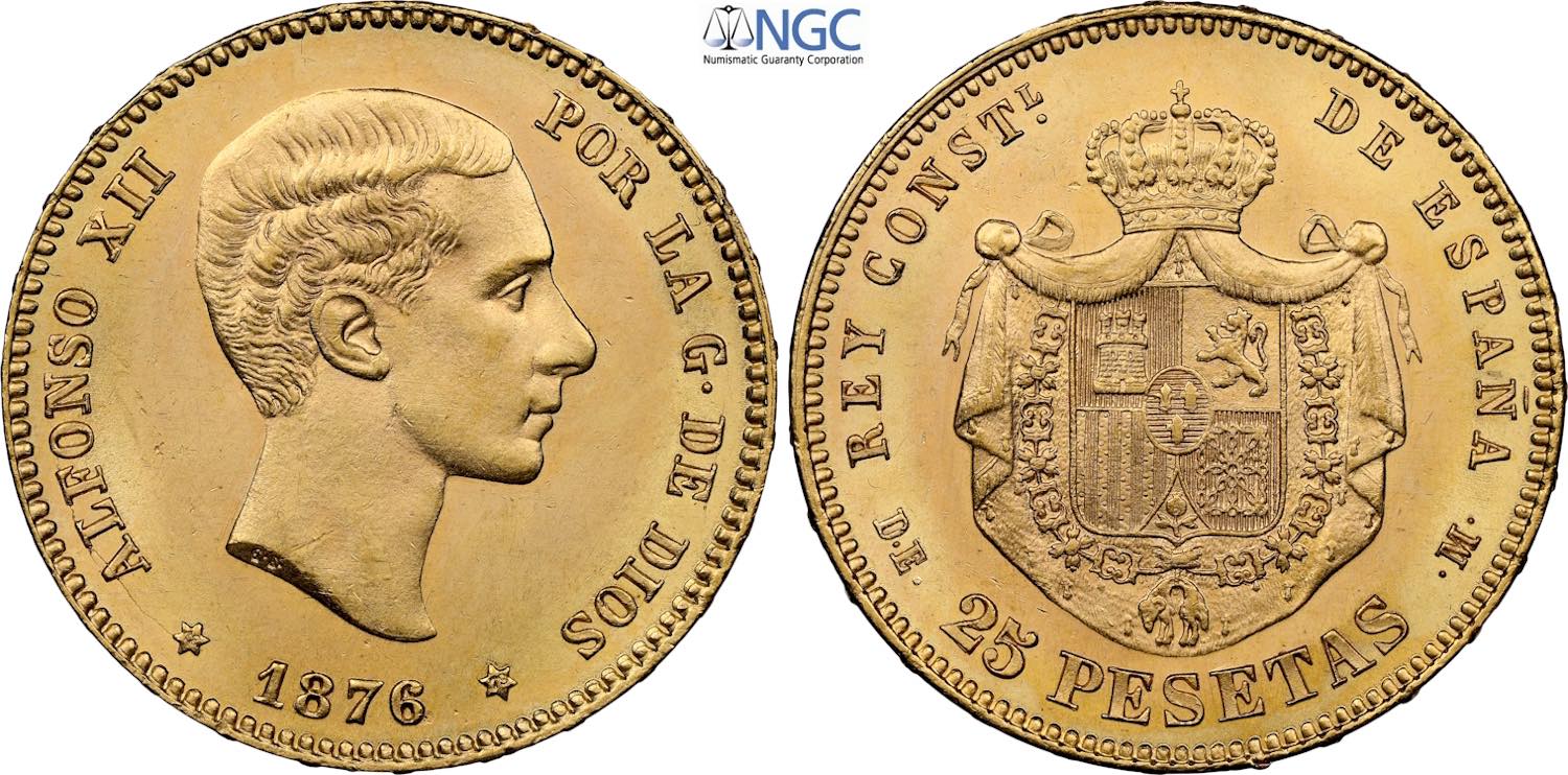 Spain, Alfonso XII (1874-1885), 25 Pesetas 1876 (76), Madrid mint, Au 24 mm, 8,06 g, in Slab NGC MS64 (only 1 coin is graded higher)