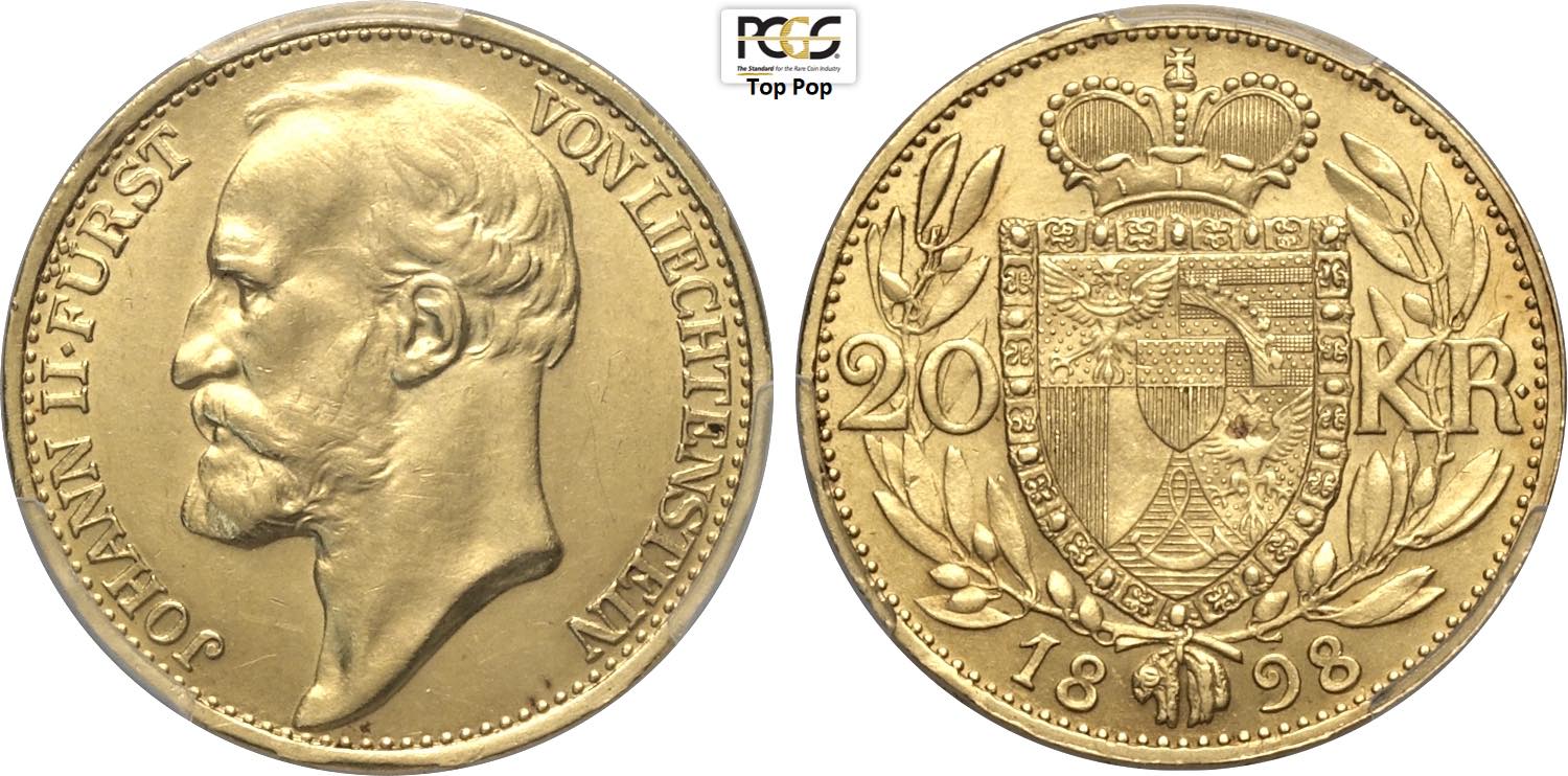 Liechtenstein, John II (1858-1929), 20 Kronen 1898, Wien mint, mintage: 1500, Au 21 mm, 6,77 g, in Slab PCGS MS64 Top Pop (cert. 49960599)