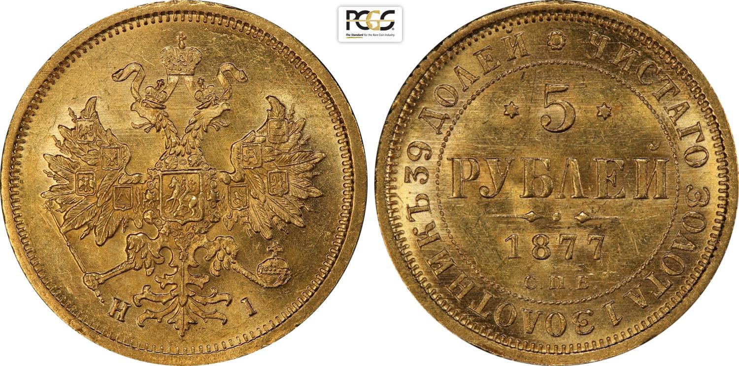 Russia, Alexander II (1855-1881), 5 Roubles 1877-HI, S. Petersburg mint, Bit-25, Au 22,6 mm, 6,54 g, in Slab PCGS MS62 (only 7 coins are ...