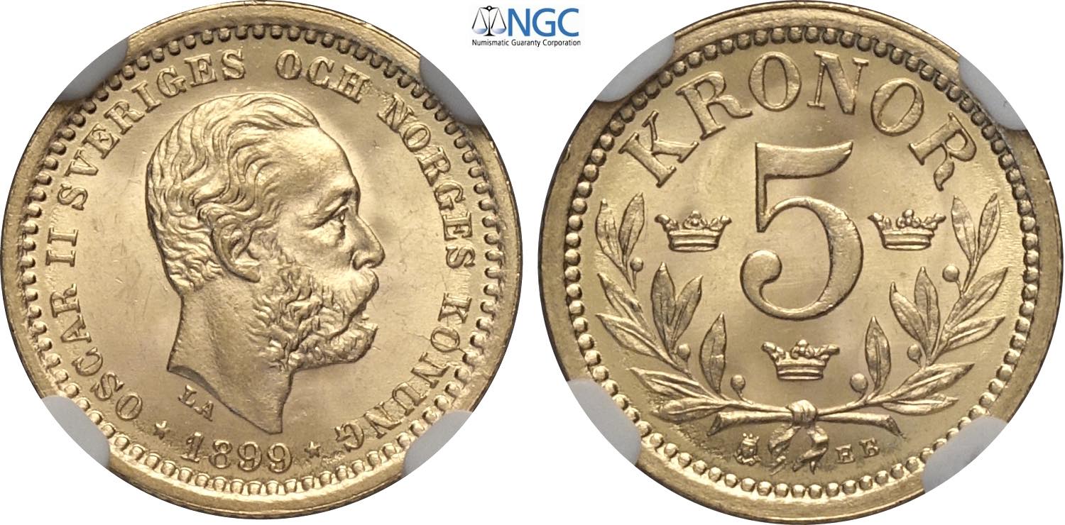 Sweden, Oscar II (1872-1907), 5 Kronor 1899-EB, Kungsholmen mint, Au 16 mm, 2,24 g, eccezionale, in Slab NGC MS66