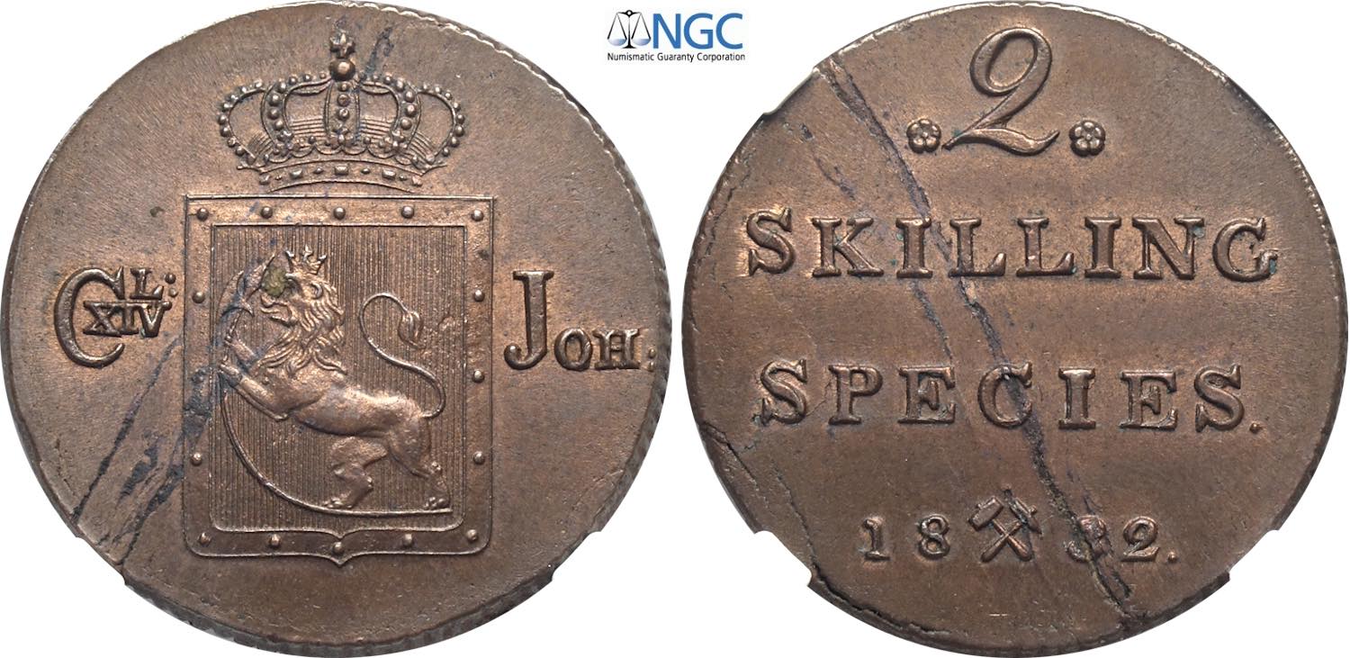 Norway, Carl XIV Johan (1818-1844), 2 Skilling 1832, Kongsberg mint, Cu 29,5 mm, 18,71 g, in Slab NGC MS62 BN (only 1 coin is graded higher)