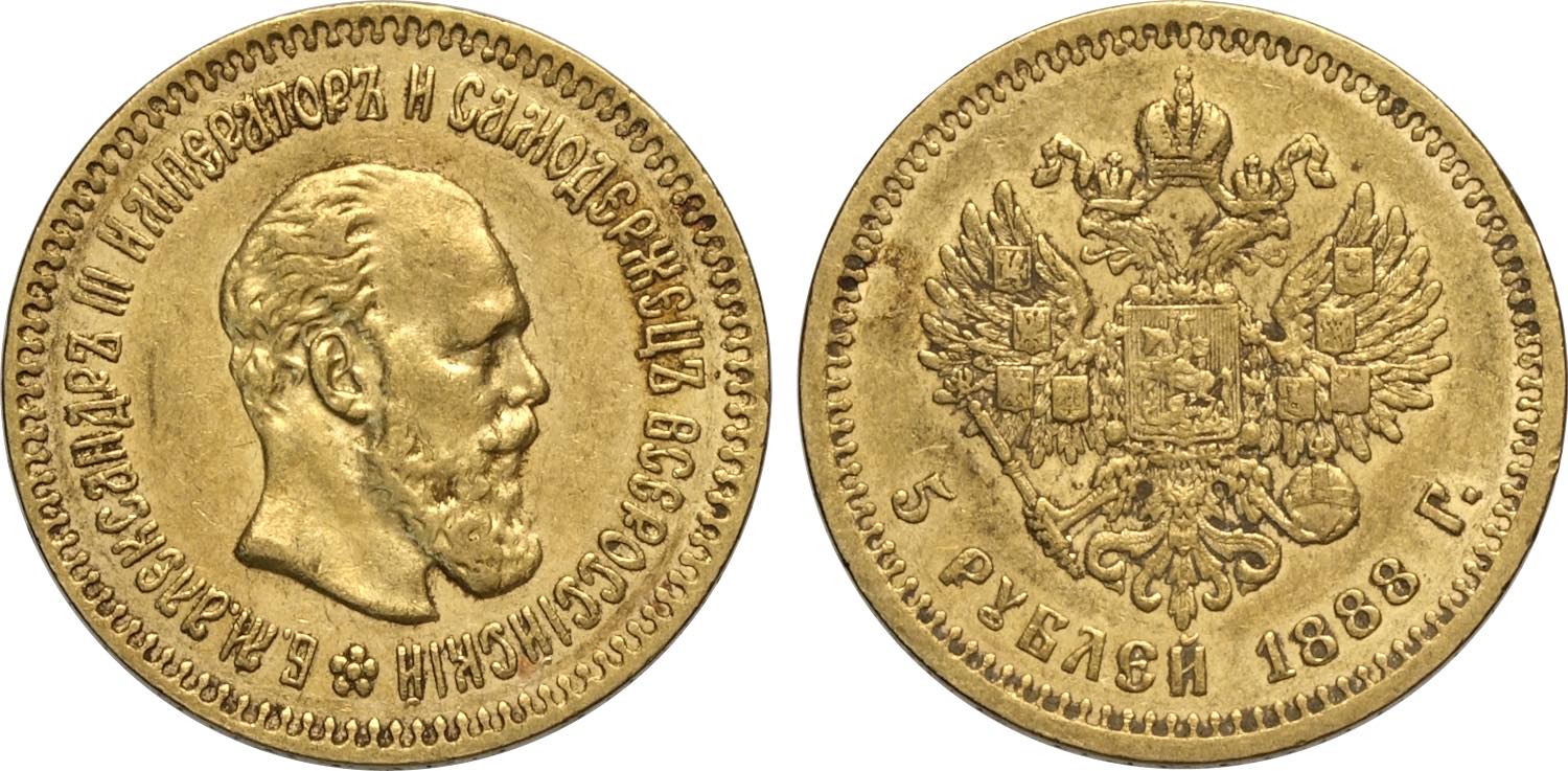 Russia, Alexander III (1881-1894), 5 Roubles 1888, S. Petersburg mint, Au 21,3 mm, 6,44 g, BB-SPL