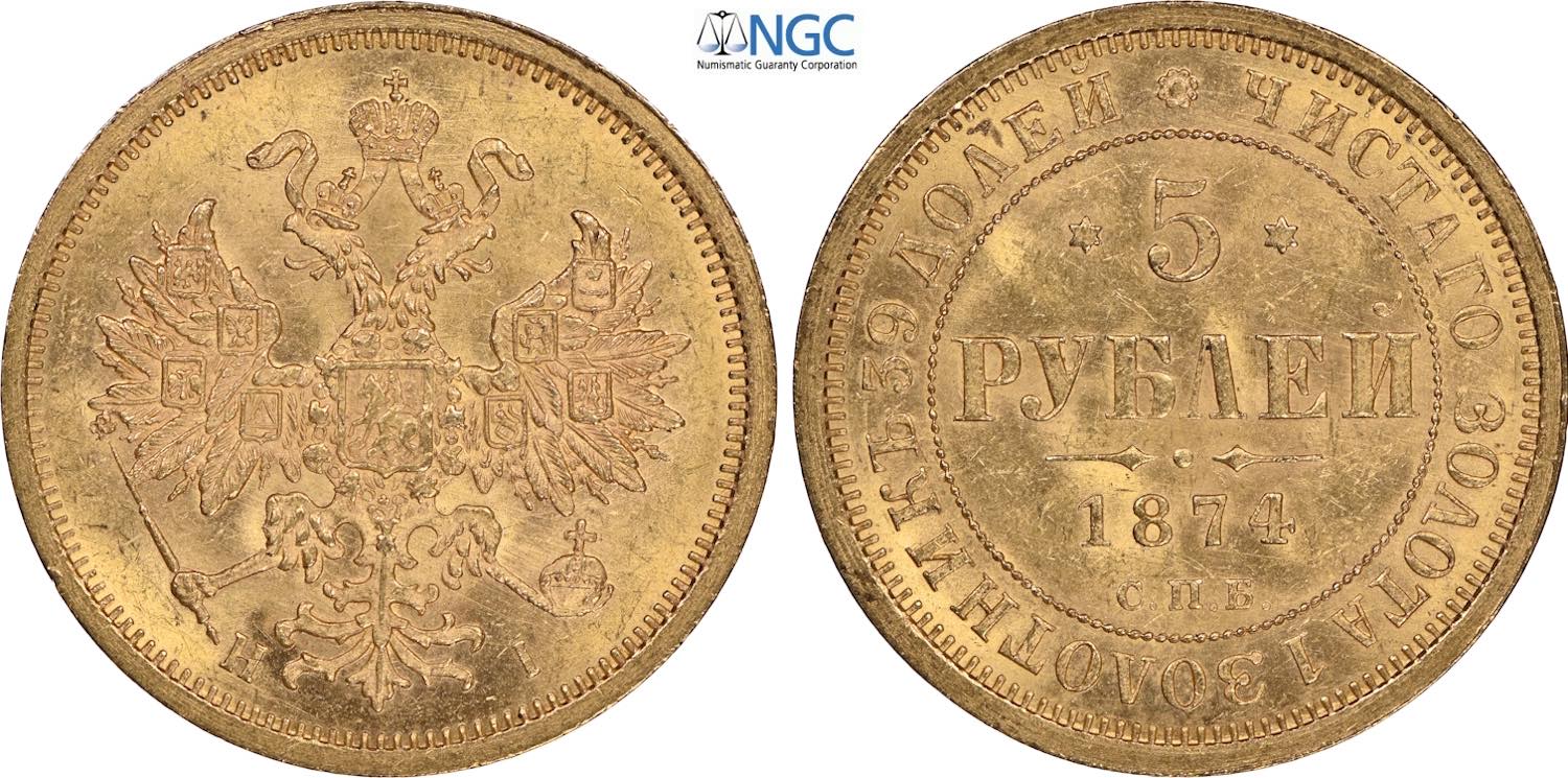 Russia, Alexander II (1855-1881), 5 Roubles 1874, S. Petersburg mint, Au 22,6 mm, 6,54 g, in Slab NGC MS63