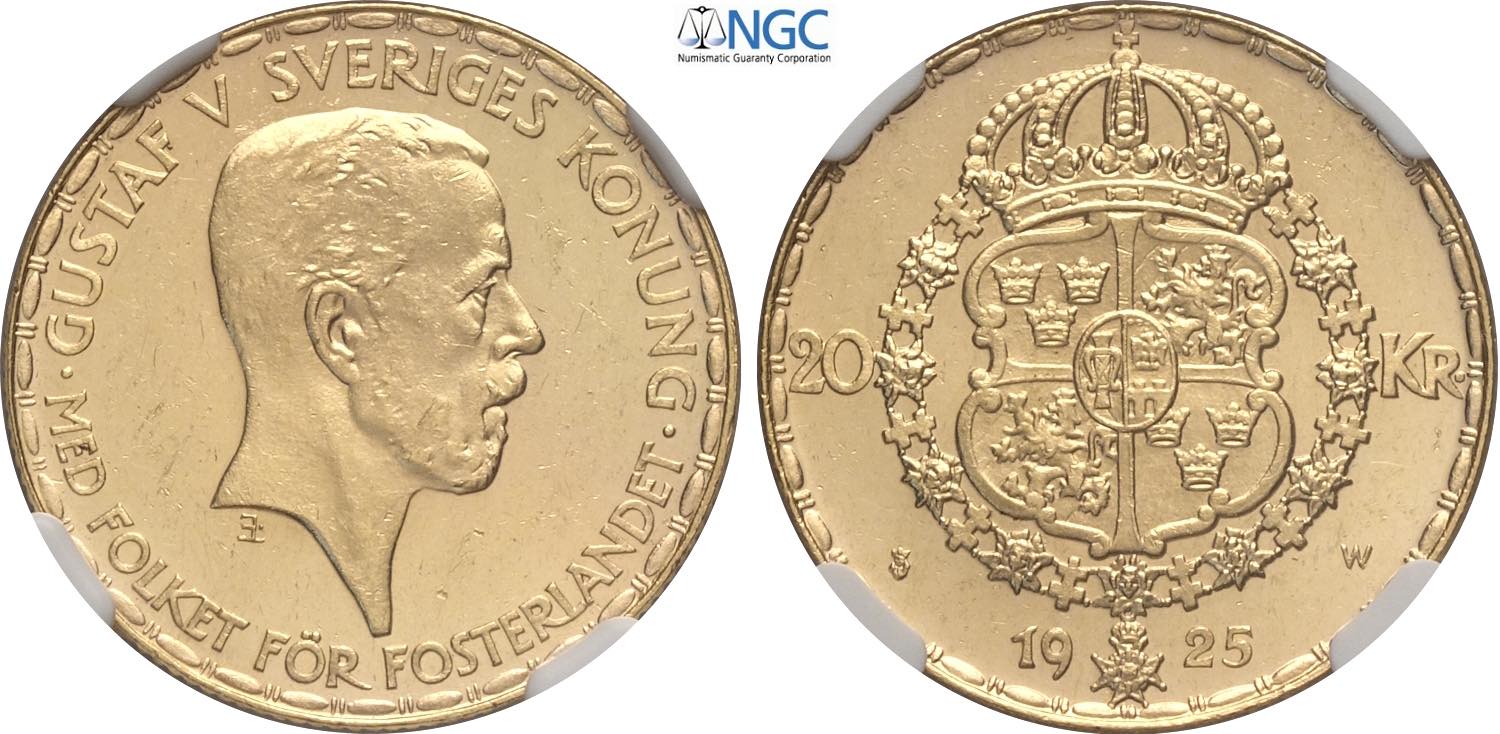 Sweden, Gustaf V (1907-1950), Prooflike 20 Kronor 1925-W, Kungsholmen mint, Au 23 mm, 8,96 g, in Slab NGC MS63 PL