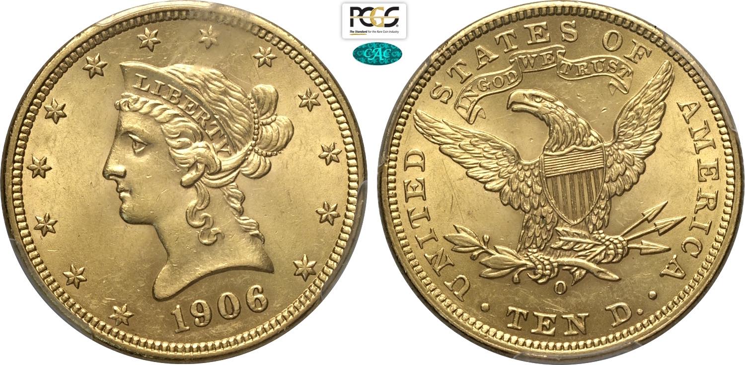 United States of America, Federal Republic (1776-), Coronet Head eagles, 10 Dollars 1906-O, New Orleans mint, Au 27 mm, 16,72 g, in Slab ...