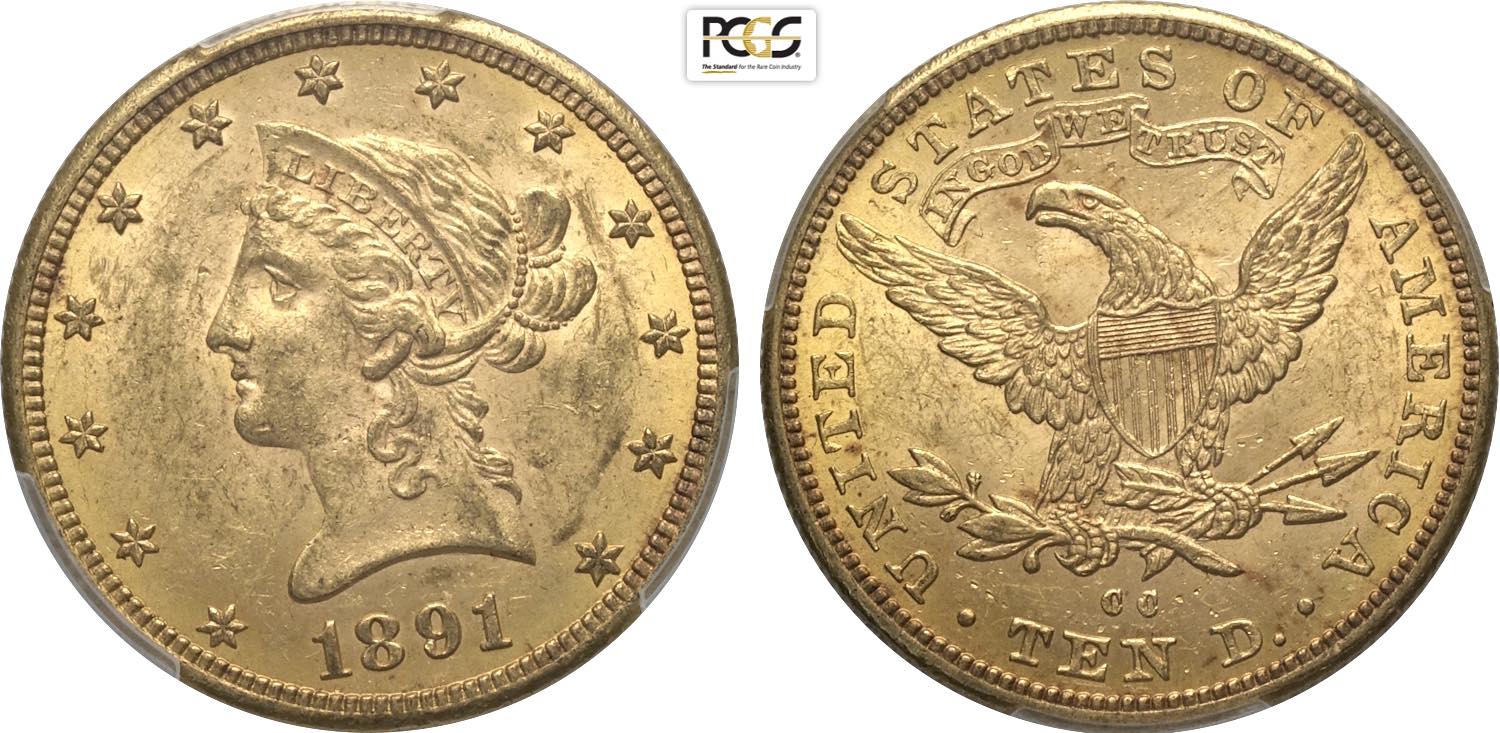 United States of America, Federal Republic (1776-), Coronet Head eagles, 10 Dollars 1891-CC, Carsons City mint, Au 27 mm, 16,72 g, in Slab ...