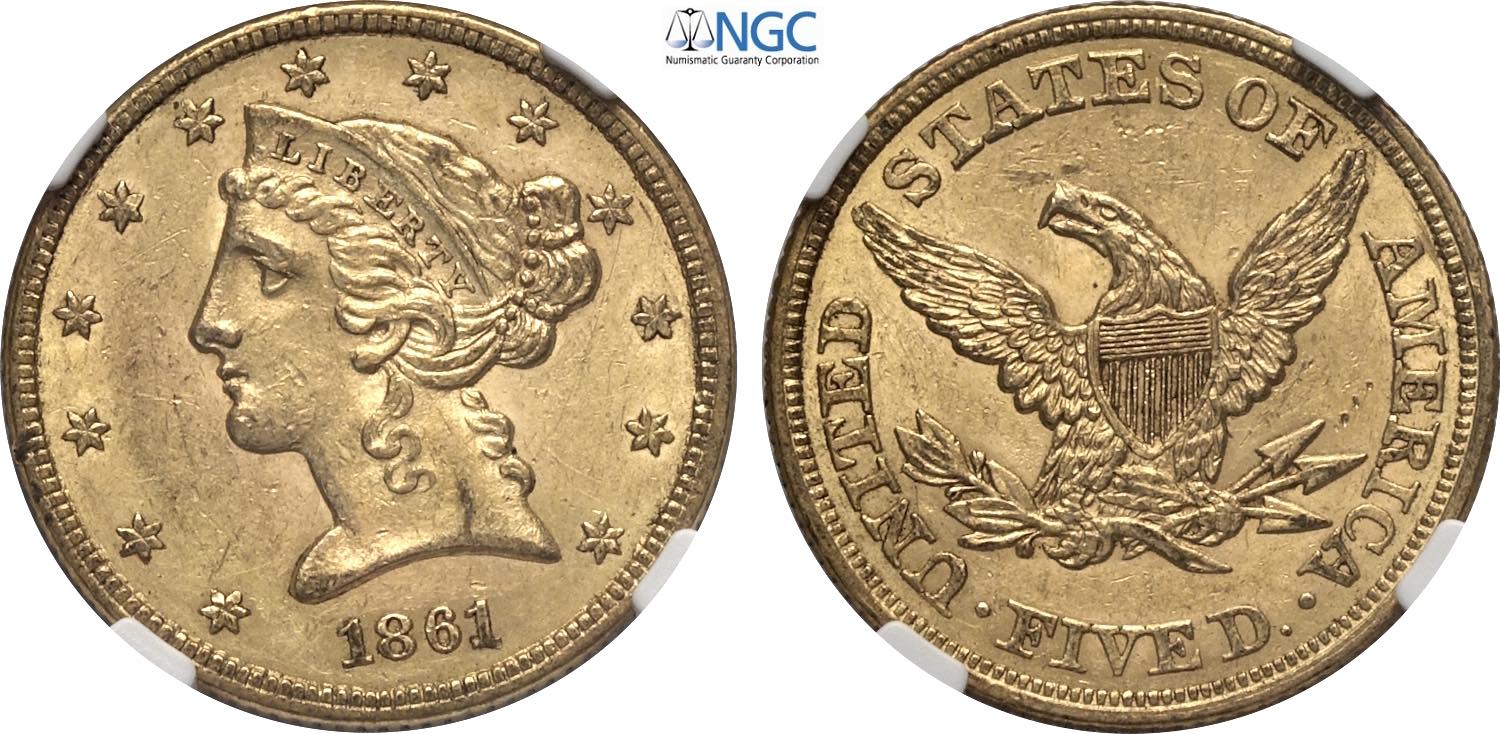 United States of America, Federal Republic (1776-), Coronet Head half eagles, 5 Dollars 1861, Philadelphia mint, Au 21,6 mm, 8,36 g, in ...