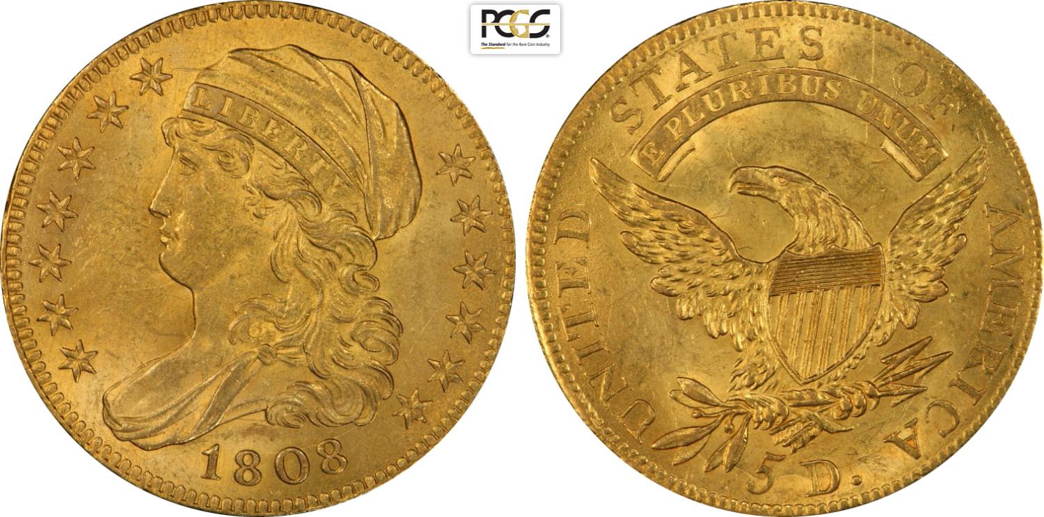 United States of America, Federal Republic (1776-), Turban Head half eagles, 5 Dollars 1808, Philadelphia mint, Au 25 mm, 8,36 g, in Slab ...