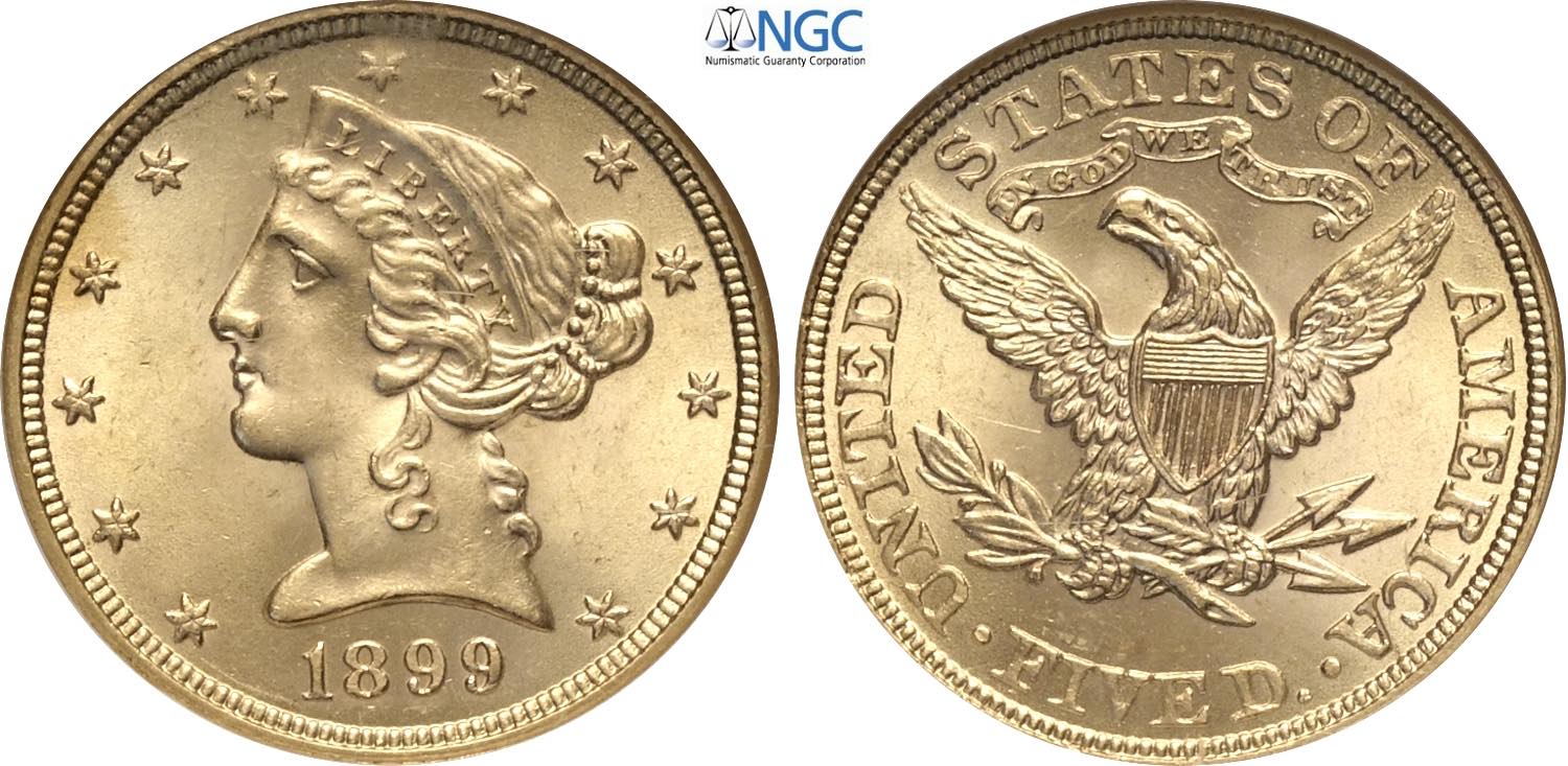 United States of America, Federal Republic (1776-), Coronet Head half eagles, 5 Dollars 1899, Philadelphia mint, Au 21,6 mm, 8,36 g, di ...
