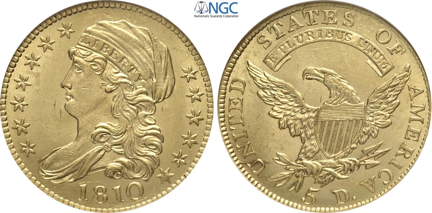 United States of America, Federal Republic (1776-), Turban Head half eagles, 5 Dollars 1810 LG date large 5, Philadelphia mint, BD-4, Au 25 ...