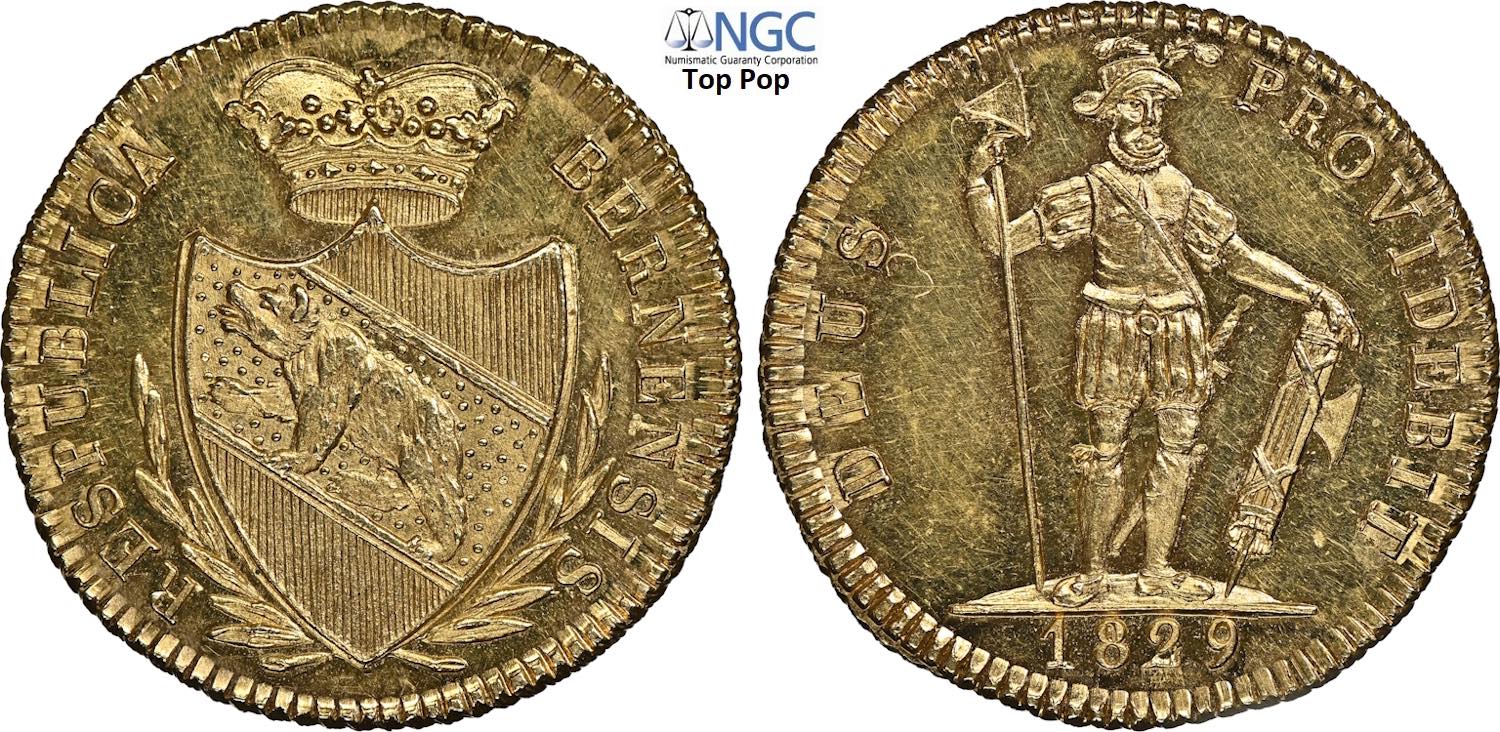 Switzerland, Bern Canton, Prooflike Duplone 1829, Au 24 mm, 7,64 g, di alta qualità con fondi speculari, in Slab NGC MS64 PL Top Pop ...
