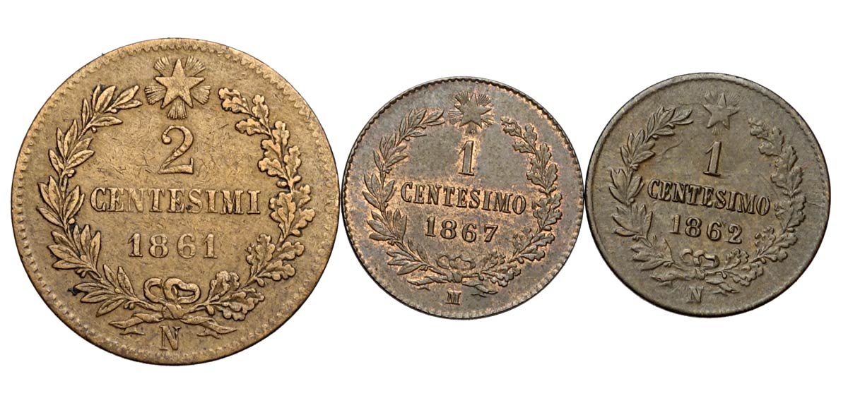 Regno d'Italia, Vittorio Emanuele II, Lotto di tre monete: 2 Centesimi 1861-N BB ex Demicheli nยฐ369, Centesimo 1862-N 2 su 1 SPL, ...