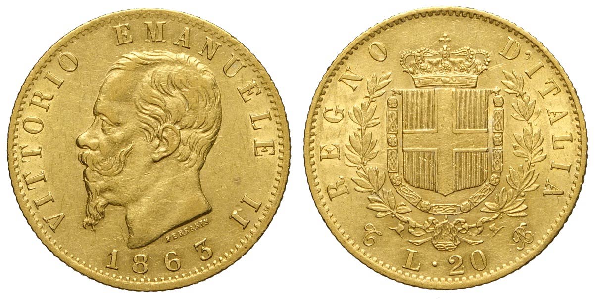 Regno d'Italia, Vittorio Emanuele II, 20 Lire 1863, Au mm 21 BB-SPL
