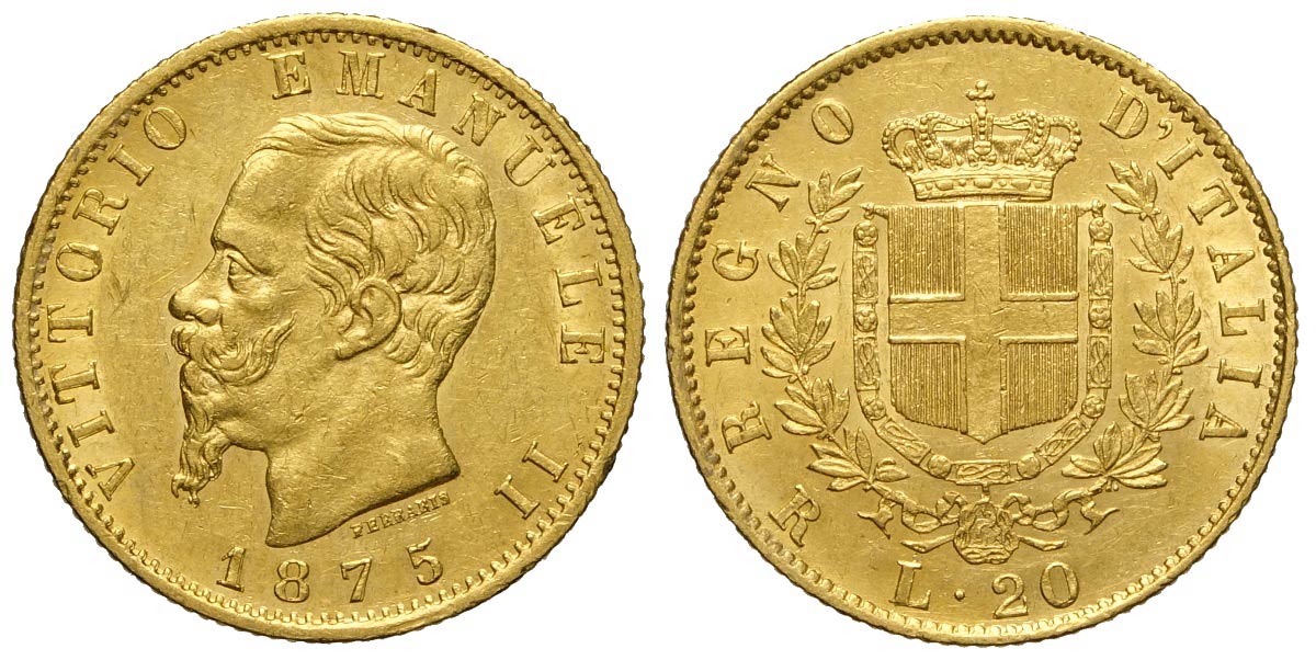 Regno d'Italia, Vittorio Emanuele II, 20 Lire 1875, Rara Au mm 21 q.SPL