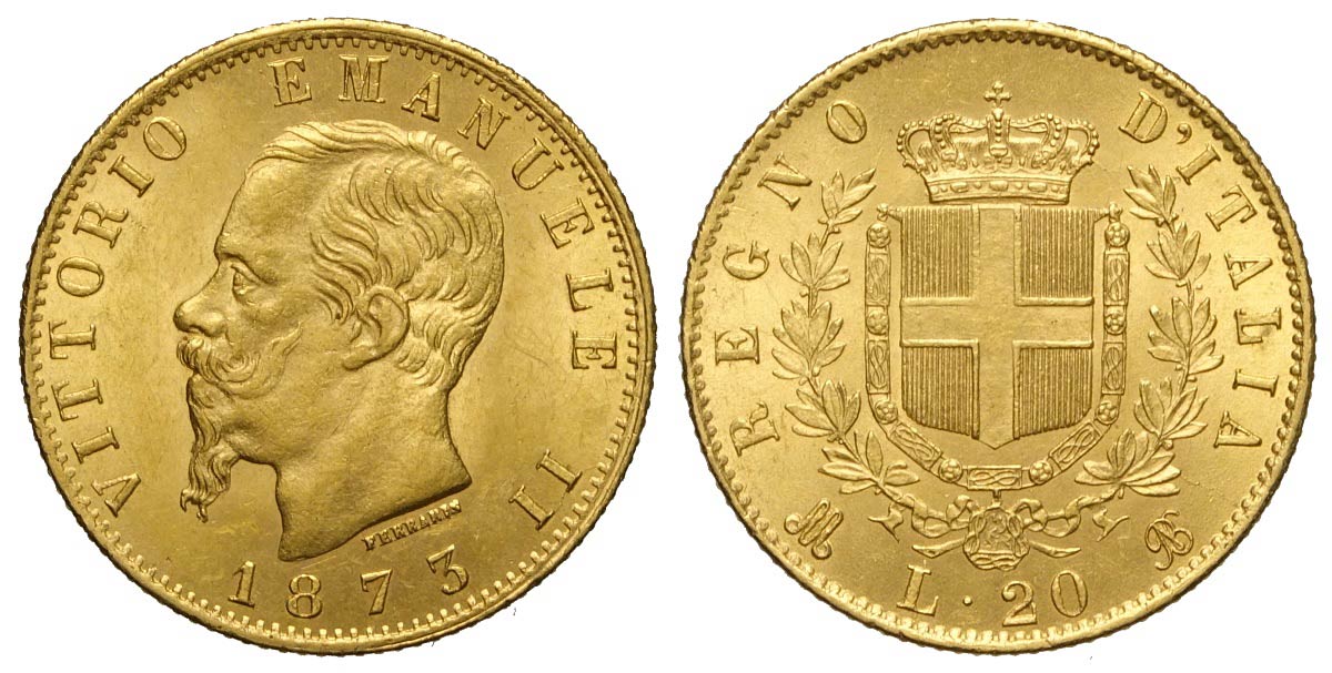 Regno d'Italia, Vittorio Emanuele II, 20 Lire 1873-M, Au mm 21 SPL-FDC