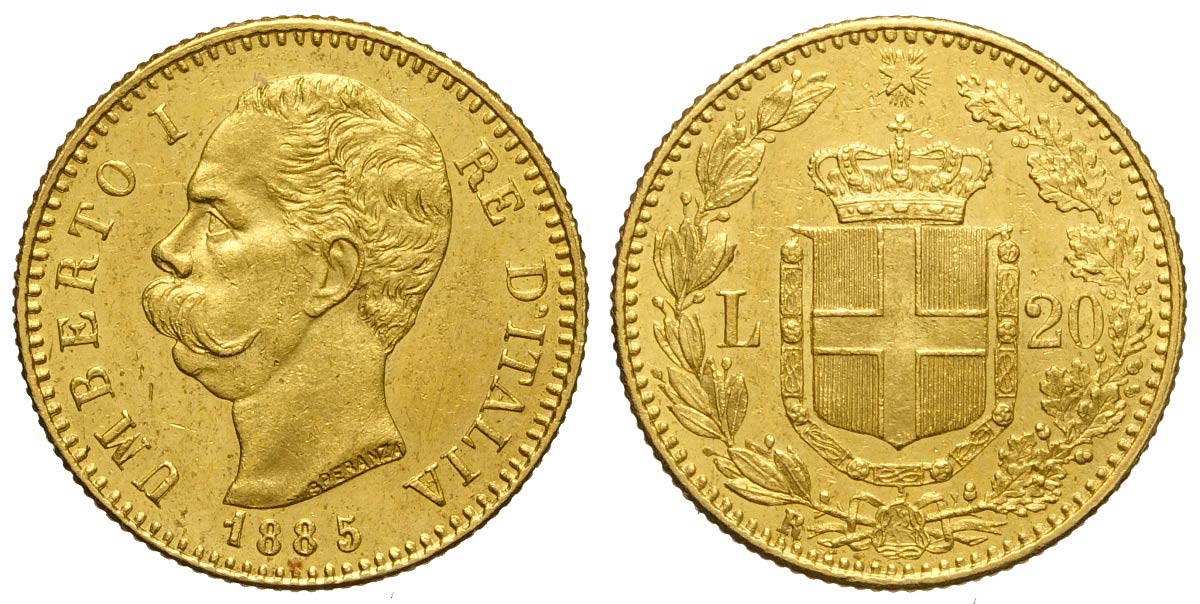 Regno d'Italia, Umberto I, 20 Lire 1885, Au mm 21 SPL