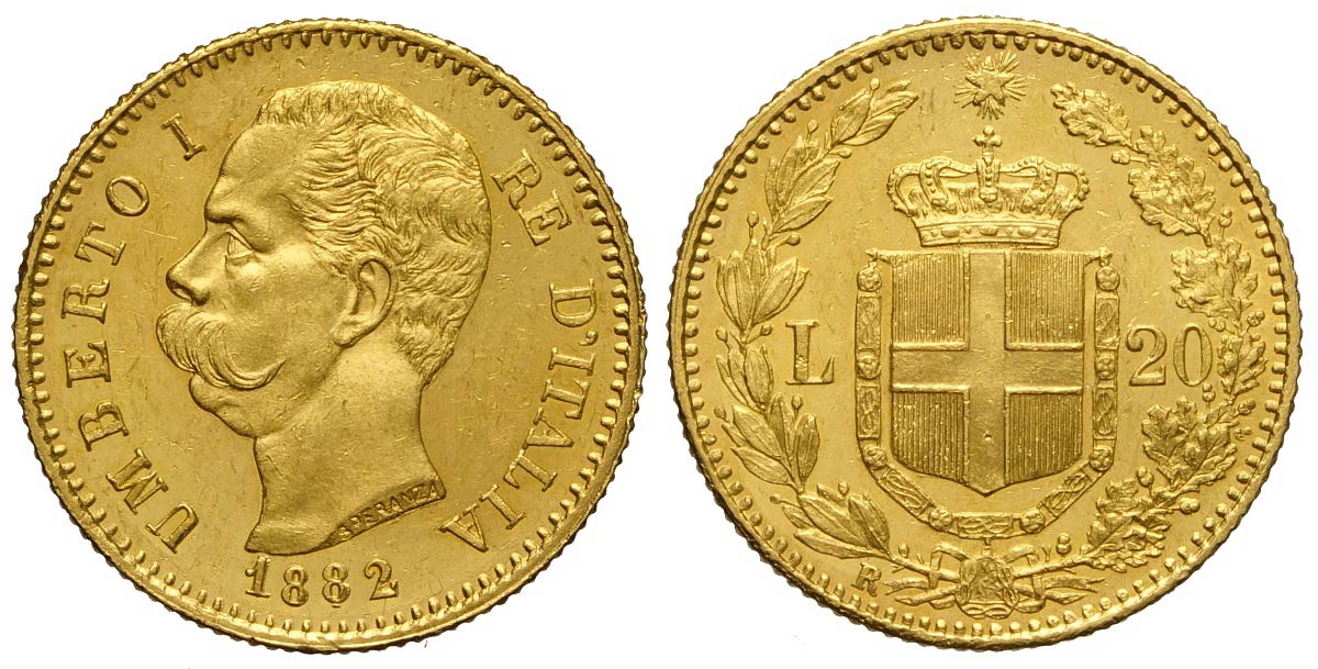 Regno d'Italia, Umberto I, 20 Lire 1882, Au mm 21 q.FDC