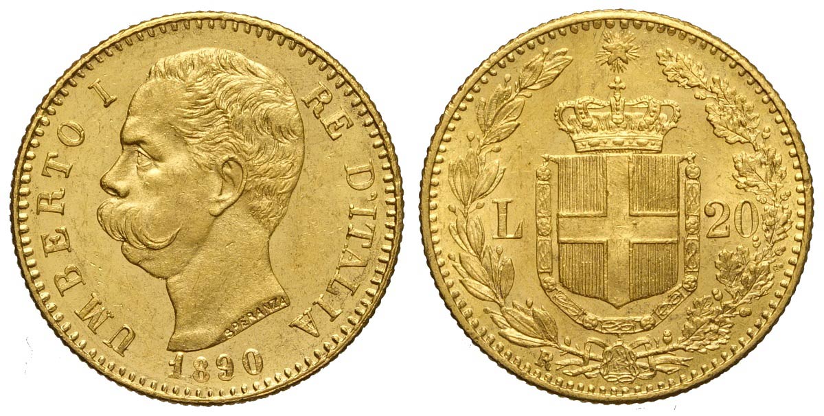 Regno d'Italia, Umberto I, 20 Lire 1890, Au mm 21 SPL-FDC