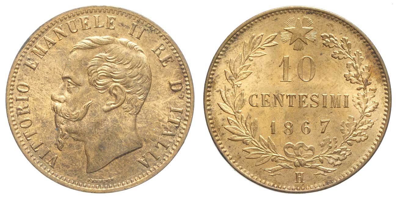 Regno d'Italia, Vittorio Emanuele II, 10 Centesimi 1867-H, Cu mm 30 in Slab PCGS MS-64RB