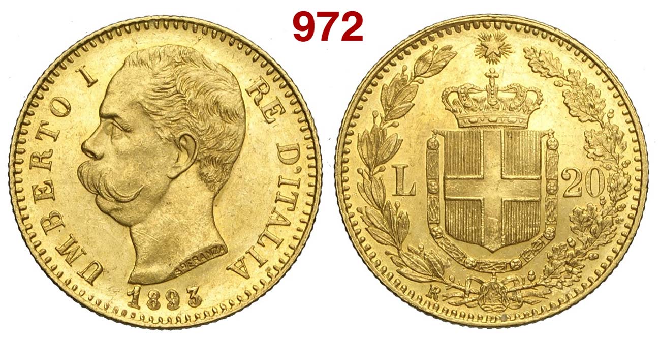 Regno d'Italia - Umberto I - 20 Lire 1893 - AU mm 21 - modesto difetto di metallo tra le foglie del rovescio altrimenti SPL