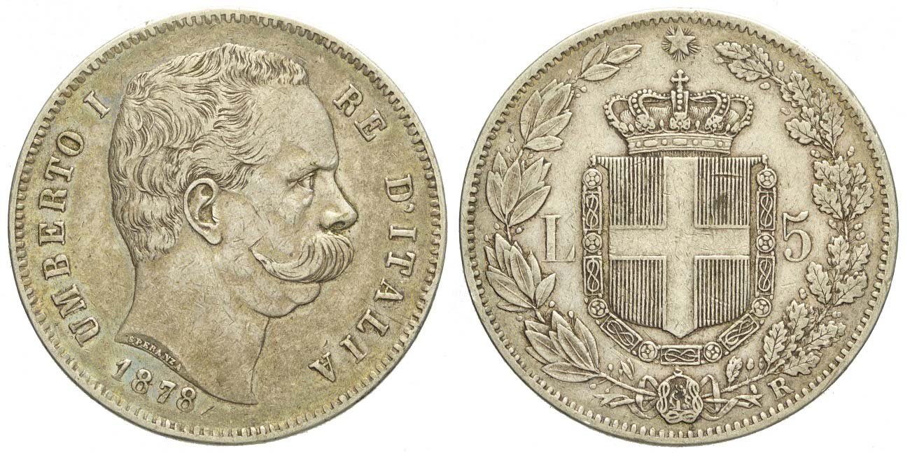 Regno dItalia, Umberto I, 5 Lire 1878, RR ...