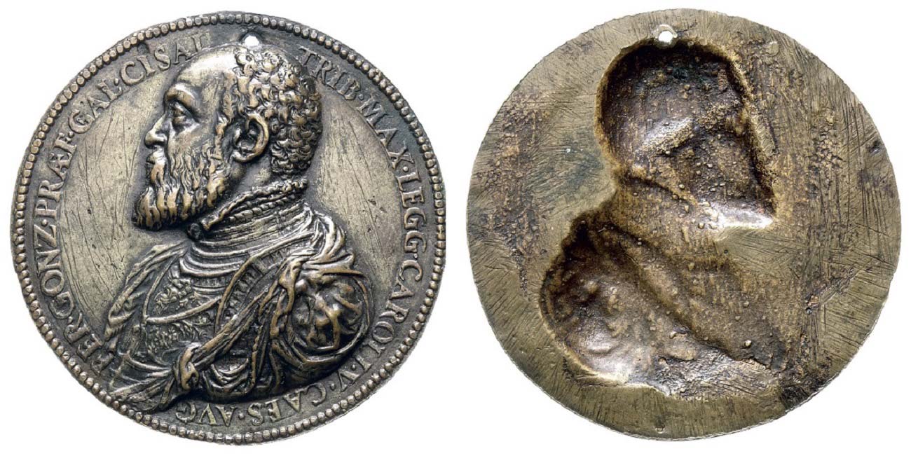 Guastalla - Placchetta uniface del Duca Ferdinando Gonzaga (1507-1557), opus Leone Leoni, Br, 70mm, RRR, foro di sospensione e graffietti ...