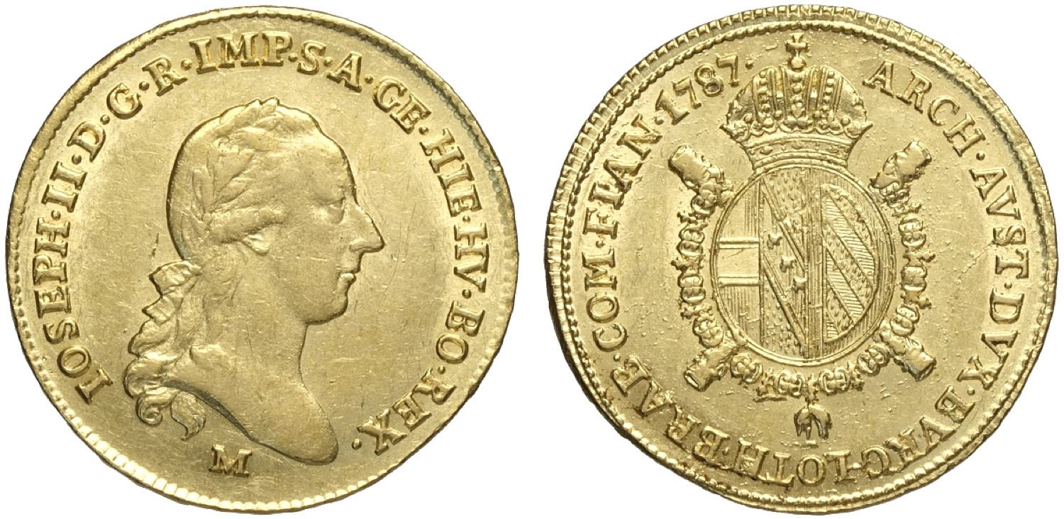 Milano, Giuseppe II d'Asburgo Lorena (1780-1790), Monetazione per l'Austria, Mezzo Sovrano 1787, Au mm 23 g 5,53 SPL-FDC