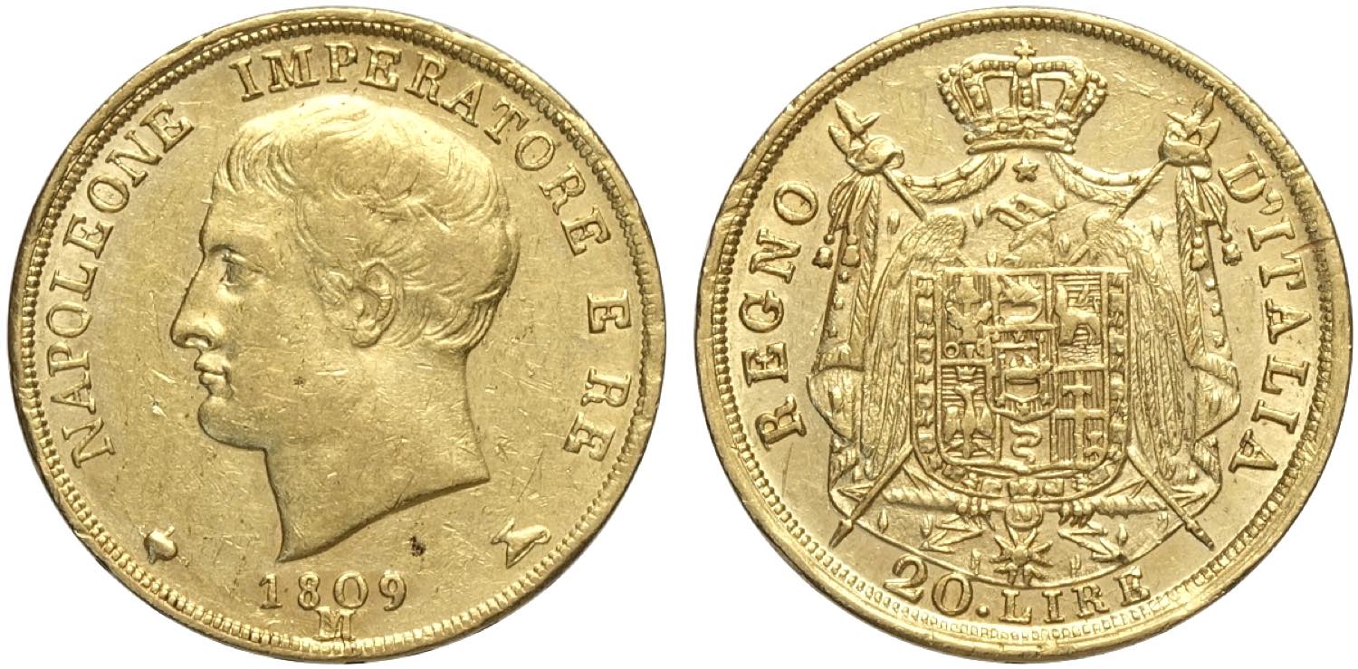 Milano, Napoleone I Re d'Italia (1805-1814), 20 Lire 1809, Au mm 21 gradevole esemplare, BB-SPL