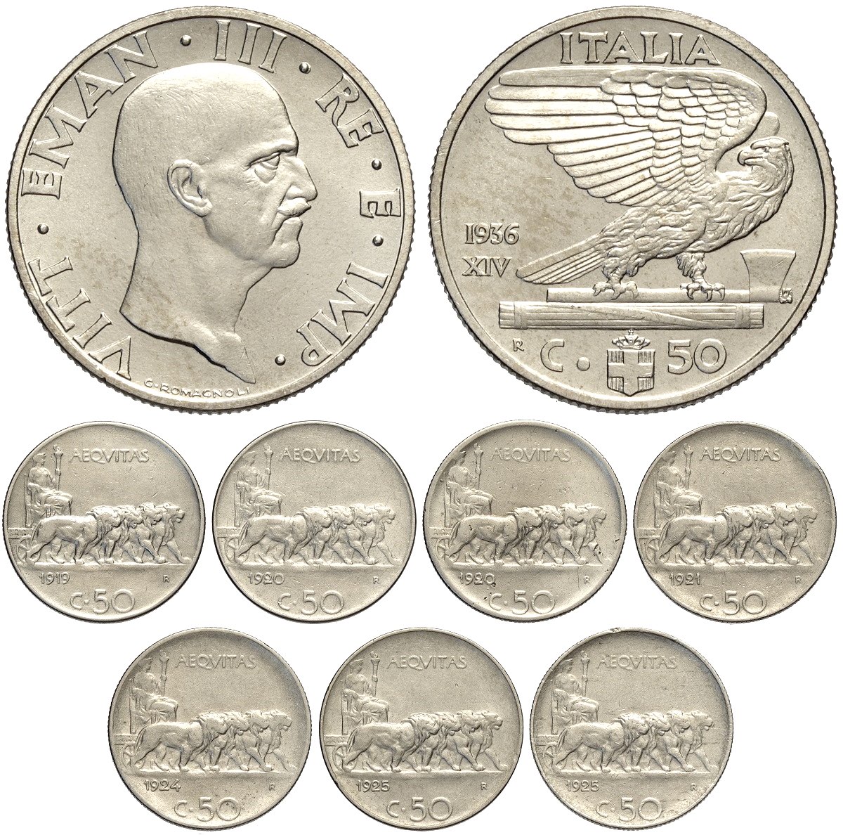 Regno d'Italia, Vittorio Emanuele III (1900-1943), Lotto di 8 Monete differenti da 50 Centesimi, si segnala: 1936 (Rara, FDC), 1919 Rigato ...