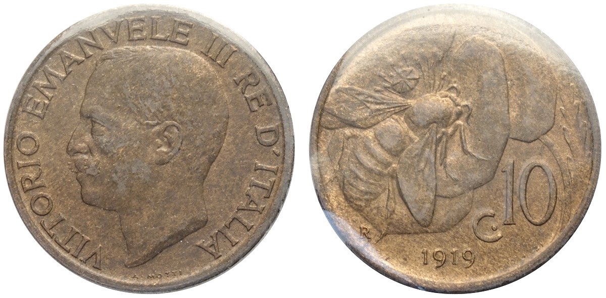 Regno d'Italia, Vittorio Emanuele III (1900-1943), 10 Centesimi 1919, Rara Cu mm 22,5 sigillata FDC da A. Bazzoni nel 1993