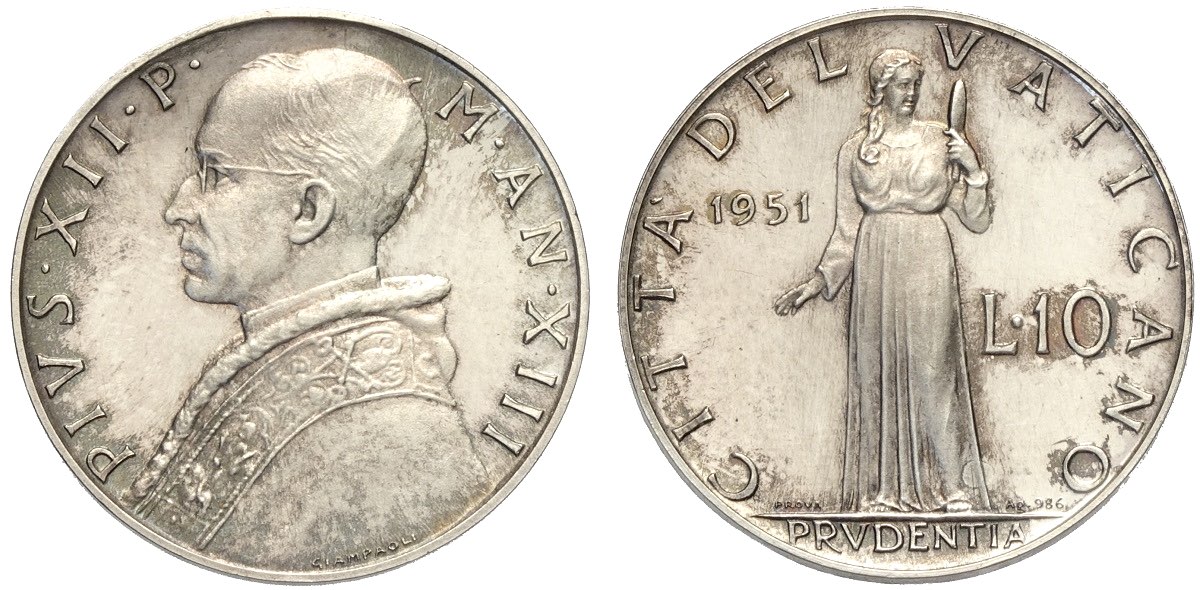 Città del Vaticano, Pio XII (1939-1958), 10 Lire 1951 Prova in argento, 20 pezzi coniati, RRRR Ag mm 23 g 6,41 FDC