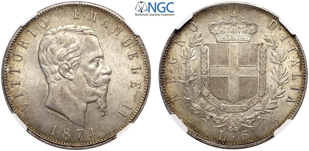 Regno d'Italia, Vittorio Emanuele II (1861-1878), 5 Lire 1874-M Milano, Ag mm 37 In Slab NGC MS63+