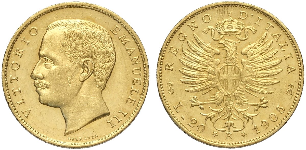Regno d'Italia, Vittorio Emanuele III (1900-1943), 20 Lire 1905, Rara Au mm 21 bellissimi fondi speculari, SPL-FDC