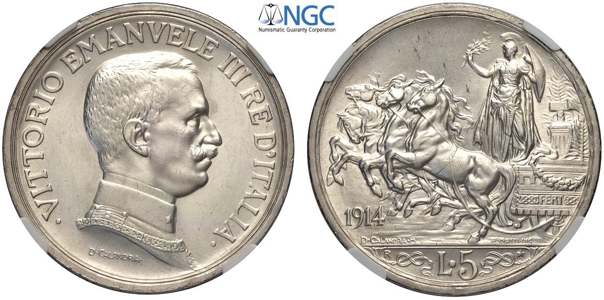Regno d'Italia, Vittorio Emanuele III (1900-1943), 5 Lire 1914, RR Ag mm 37 FDC, in Slab NGC MS64