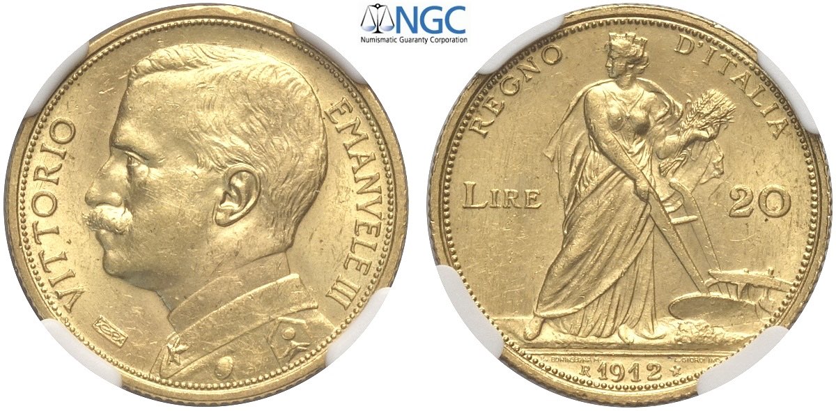 Regno d'Italia, Vittorio Emanuele III (1900-1943), 20 Lire 1912, Rara Au mm 21 in Slab NGC MS63