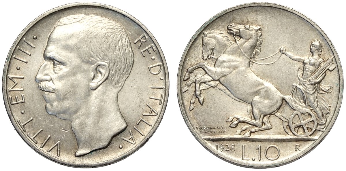 Regno d'Italia, Vittorio Emanuele III (1900-1943), 10 Lire 1928 due rosette, RR Ag mm 27 di ottima qualità per il millesimo, SPL+