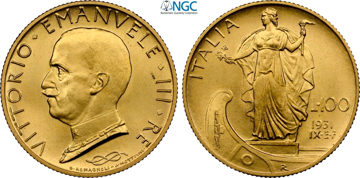 Regno d'Italia, Vittorio Emanuele III (1900-1943), 100 Lire 1931-IX, Au 23,5 mm 8,80 g, eccezionale, in Slab NGC MS65+