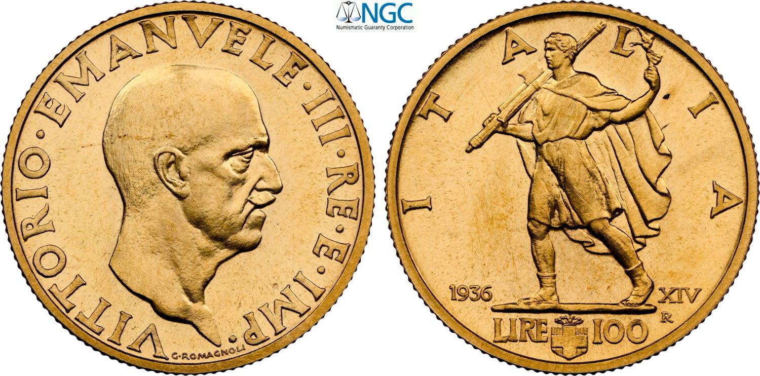 Regno d'Italia, Vittorio Emanuele III (1900-1943), 100 Lire 1936, coniati 812 esemplari, RR Au 23,5 mm 8,80 g, in Slab NGC MS65