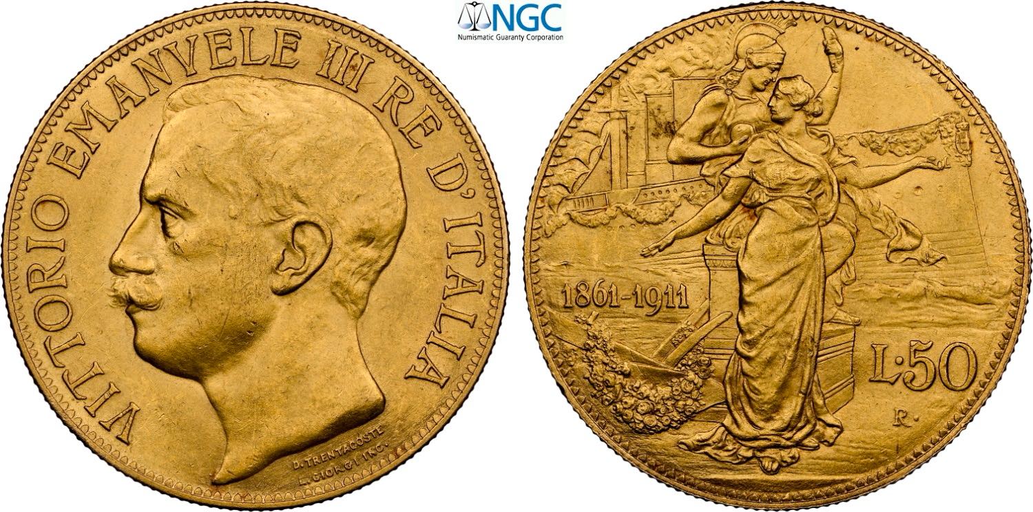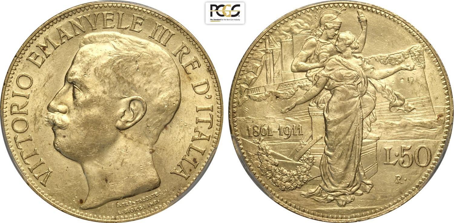 Regno d'Italia, Vittorio Emanuele III (1900-1943), 50 Lire 1911, Rara Au 28 mm 16,12 g, in Slab PCGS MS61
