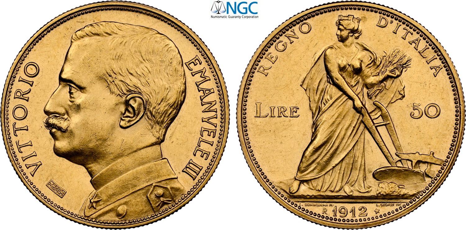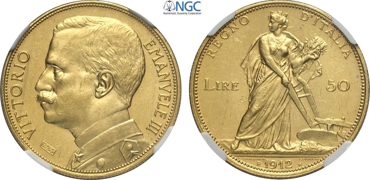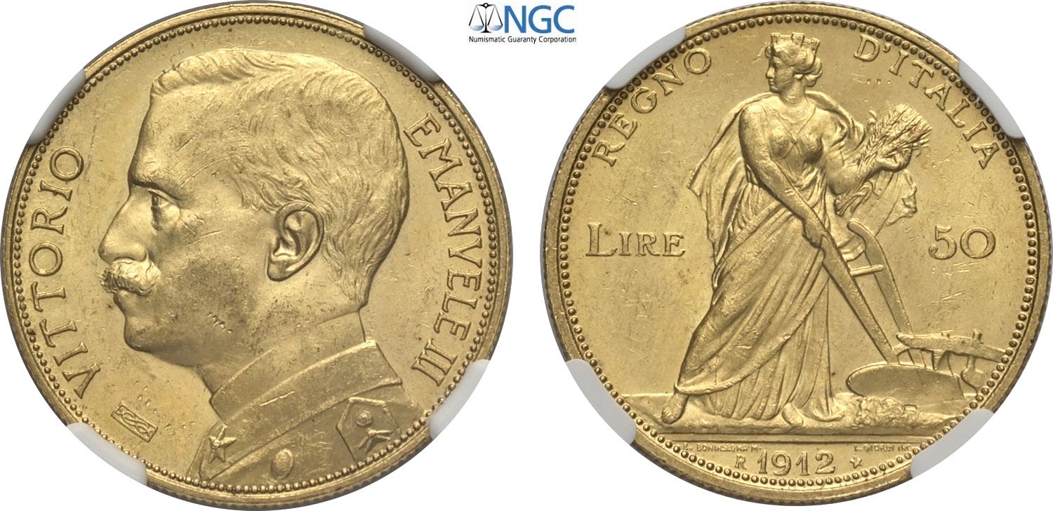Regno d'Italia, Vittorio Emanuele III (1900-1943), 50 Lire 1912, Rara Au 28 mm 16,12 g, in Slab NGC MS63