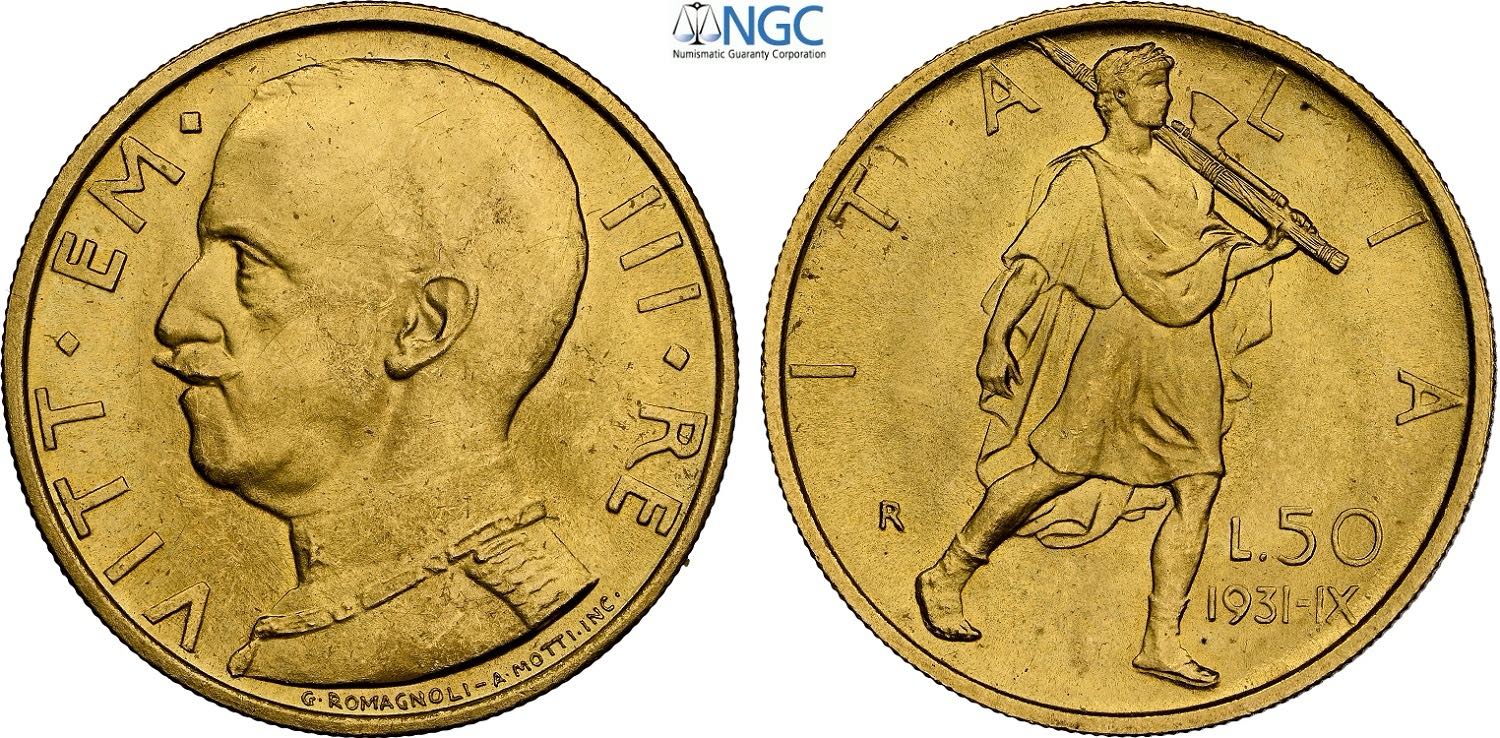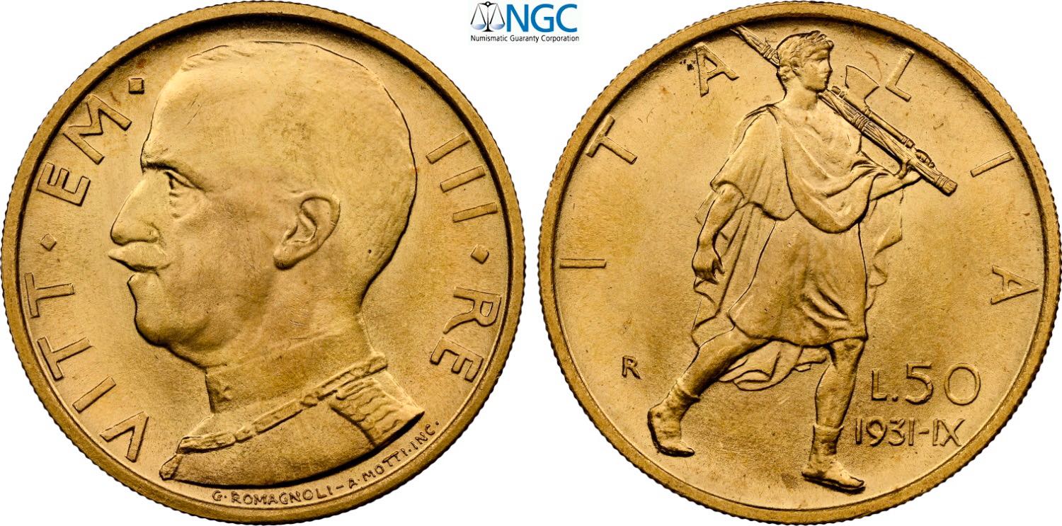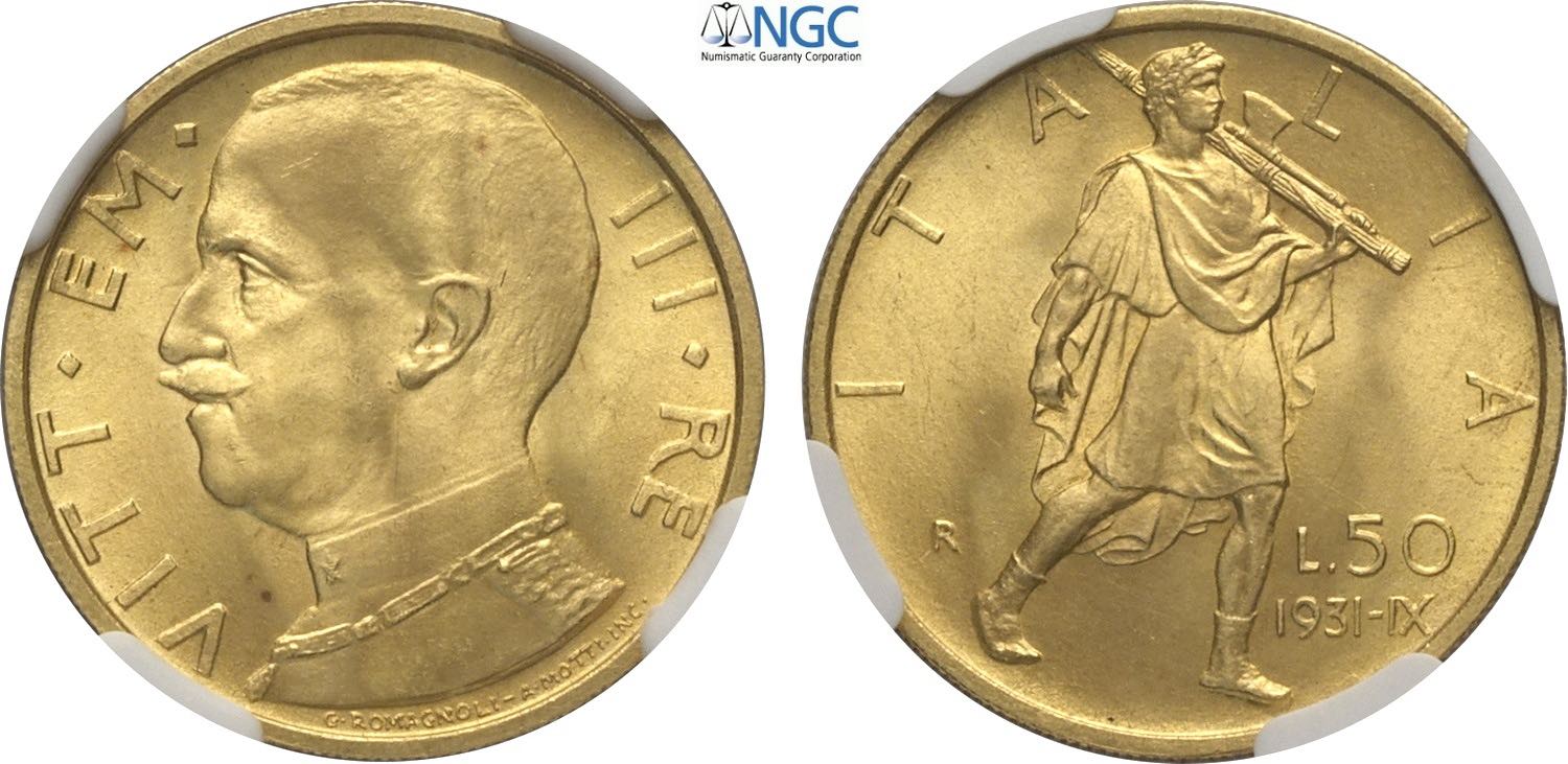 Regno d'Italia, Vittorio Emanuele III (1900-1943), 50 Lire 1931-IX, Au 20,5 mm 4,40 g, conservazione eccezionale, in Slab NGC MS66