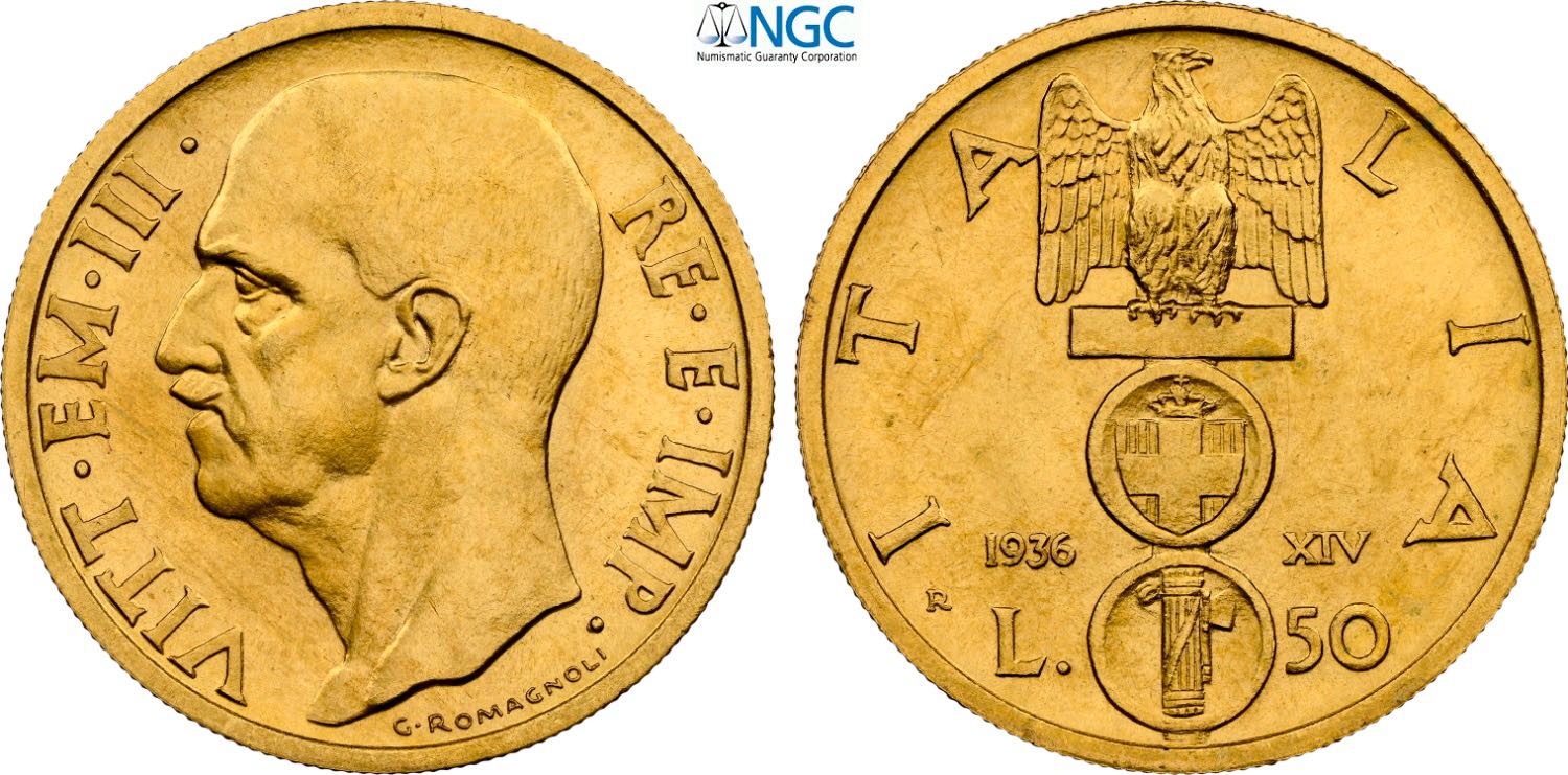 Regno d'Italia, Vittorio Emanuele III (1900-1943), 50 Lire 1936, coniati 790 esemplari, RR Au 20,5 mm 4,40 g, in Slab NGC MS64
